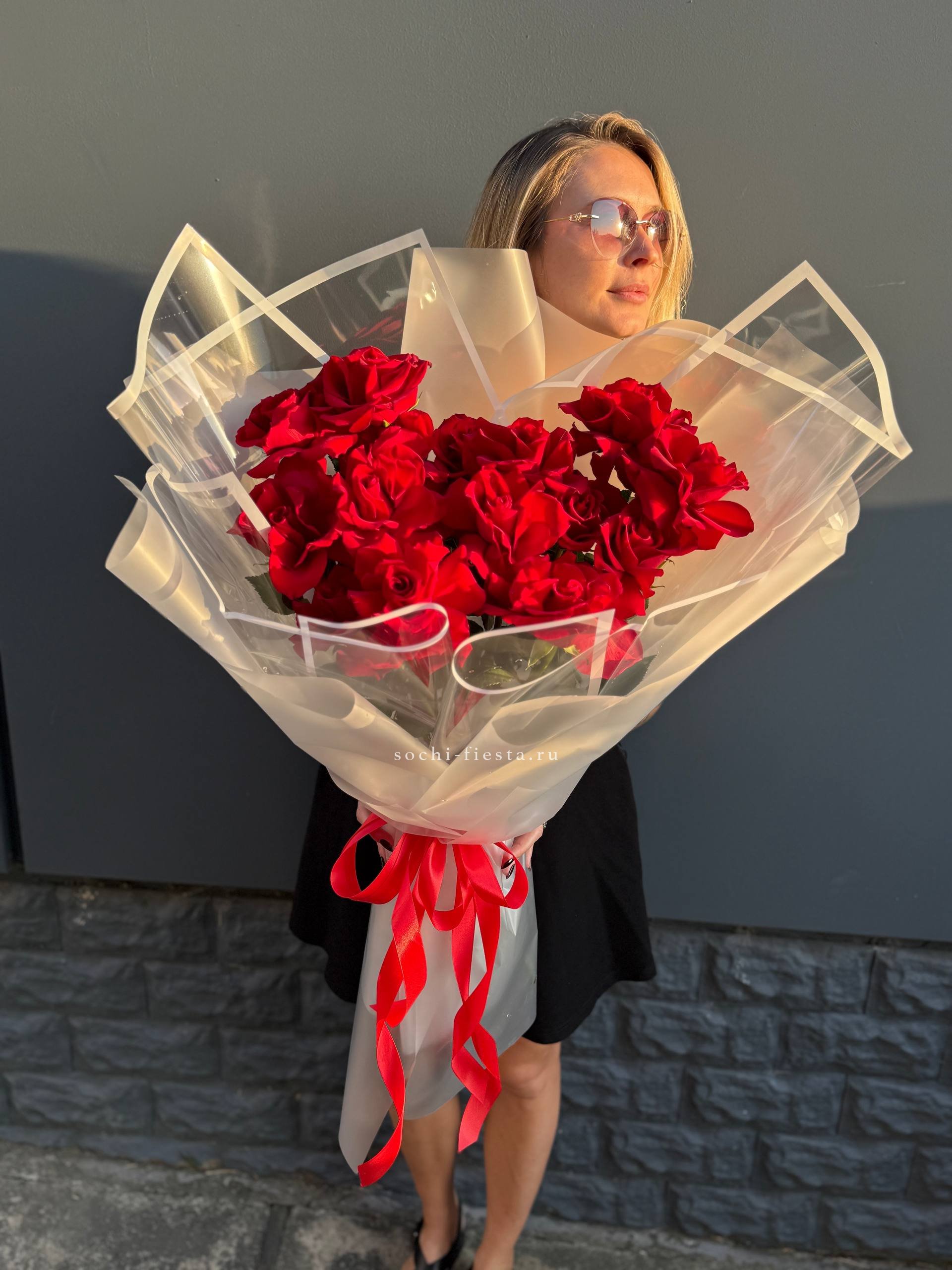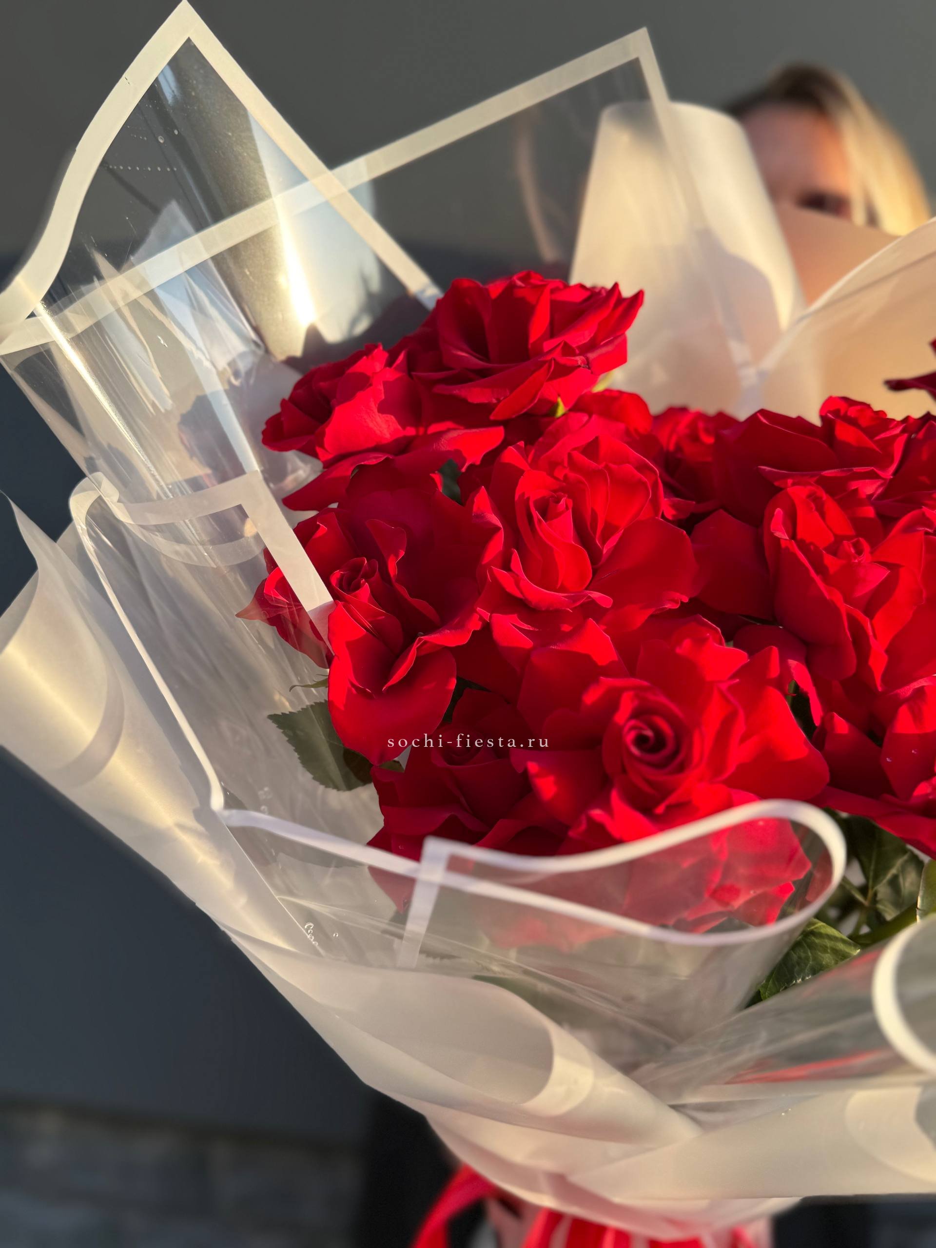Сто одна роза Madam Red образует объёмное цветовое пятно с глубоким красным оттенком. Букет занимает пространство и сразу притягивает внимание своей насыщенностью.