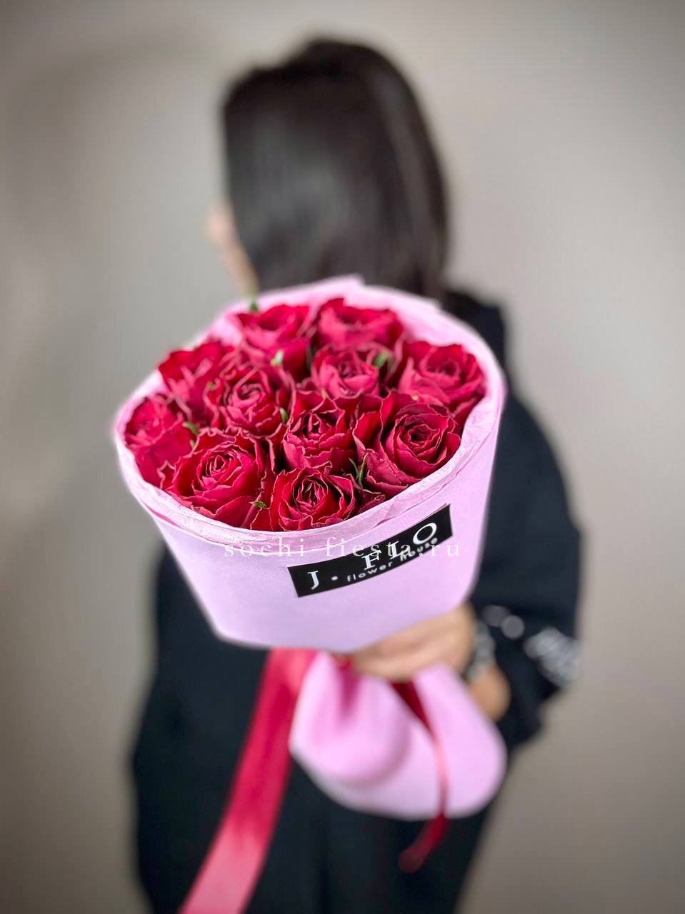 Одиннадцать бутонов кенийской розы собраны в лаконичный букет с комбинированной упаковкой. Красный цвет звучит ярко и уверенно.