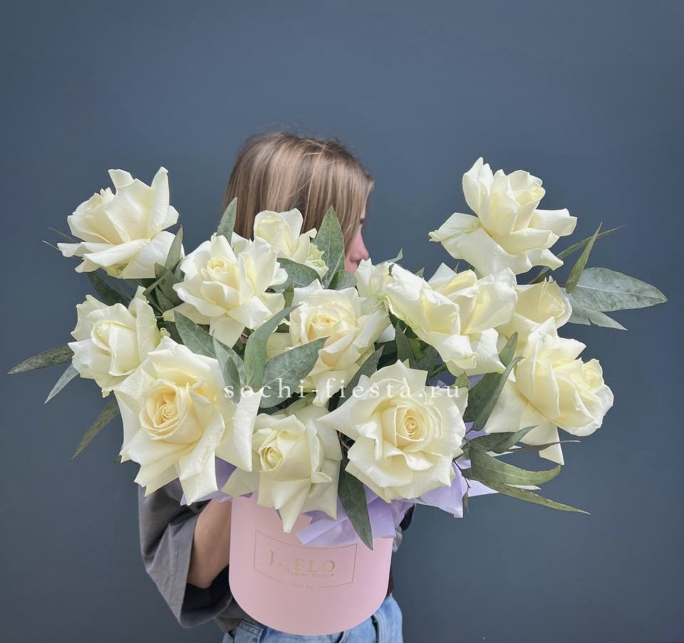 белые розы с эвкалиптом в боксе 16.