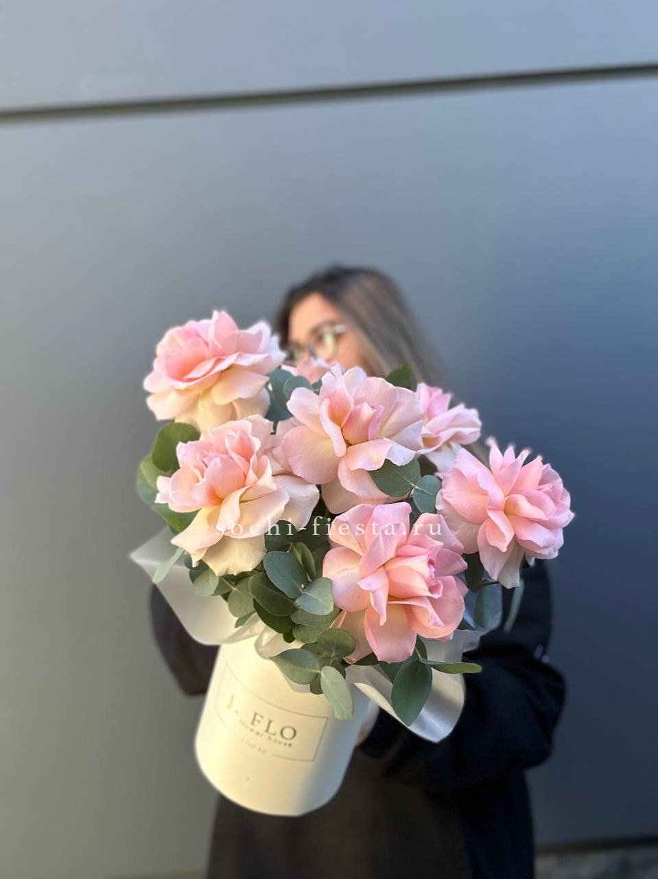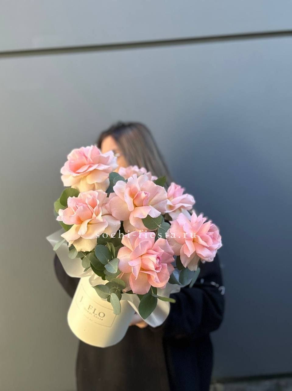 Пять пышных соцветий гортензии собраны в плотный букет с ветками эвкалипта. Розовый оттенок лепестков создаёт мягкое облако цвета, а зелень добавляет свежести композиции. Такой формат хорош для интерьера в светлых тонах.