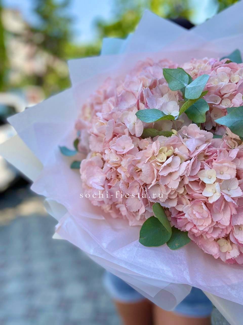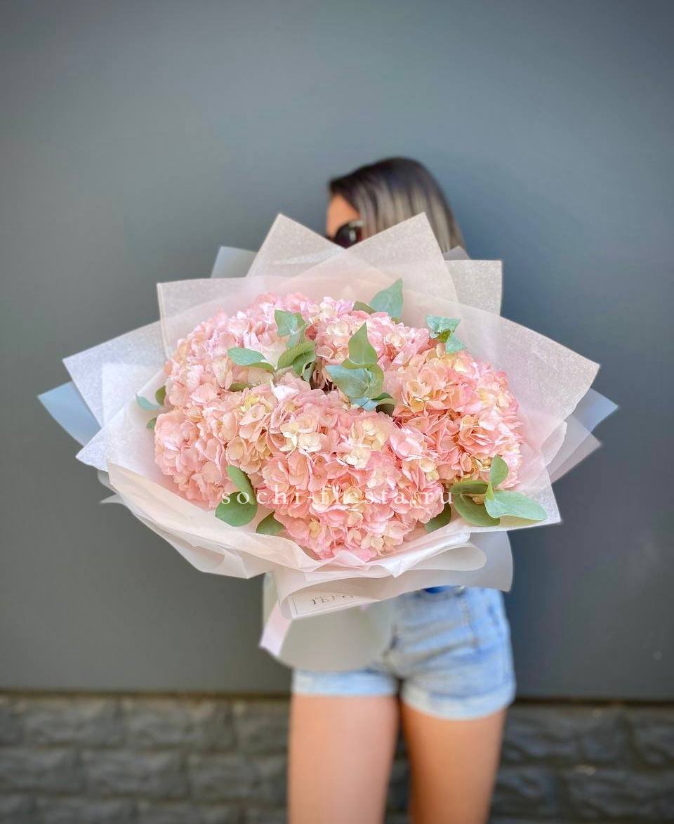 Пять соцветий розовой гортензии в обрамлении матовых веточек эвкалипта. Сочная палитра и продуманная форма делают этот букет удобным для размещения даже в компактном пространстве.