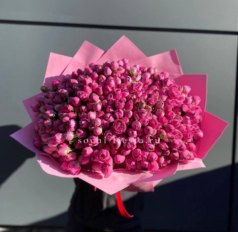 Букет выглядит объемно и держит форму благодаря плотной сборке.