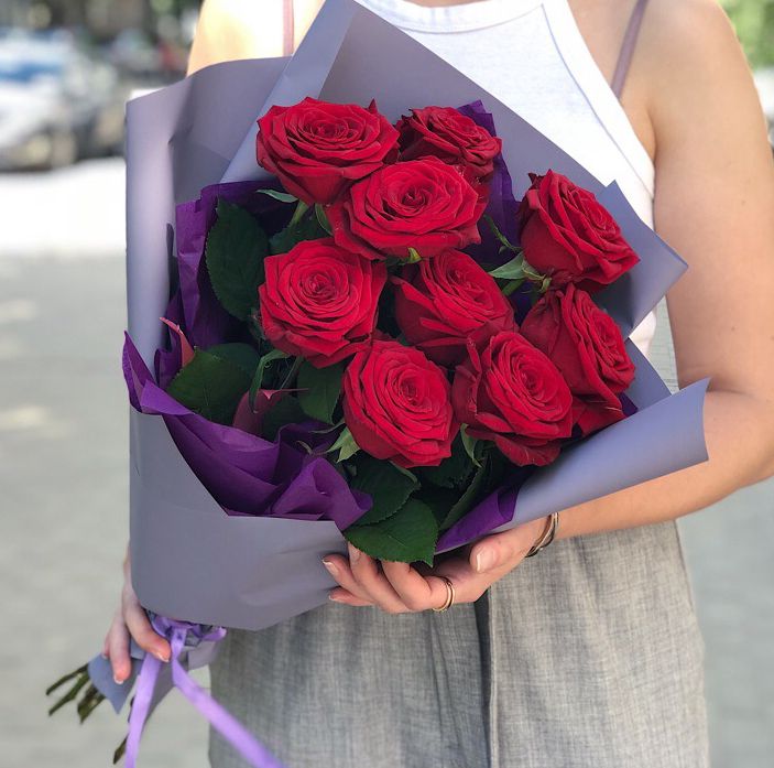 Девять вывернутых роз с насыщенными лепестками создают объёмную композицию. Эвкалипт добавляет свежести и визуальной лёгкости между бутонами.
