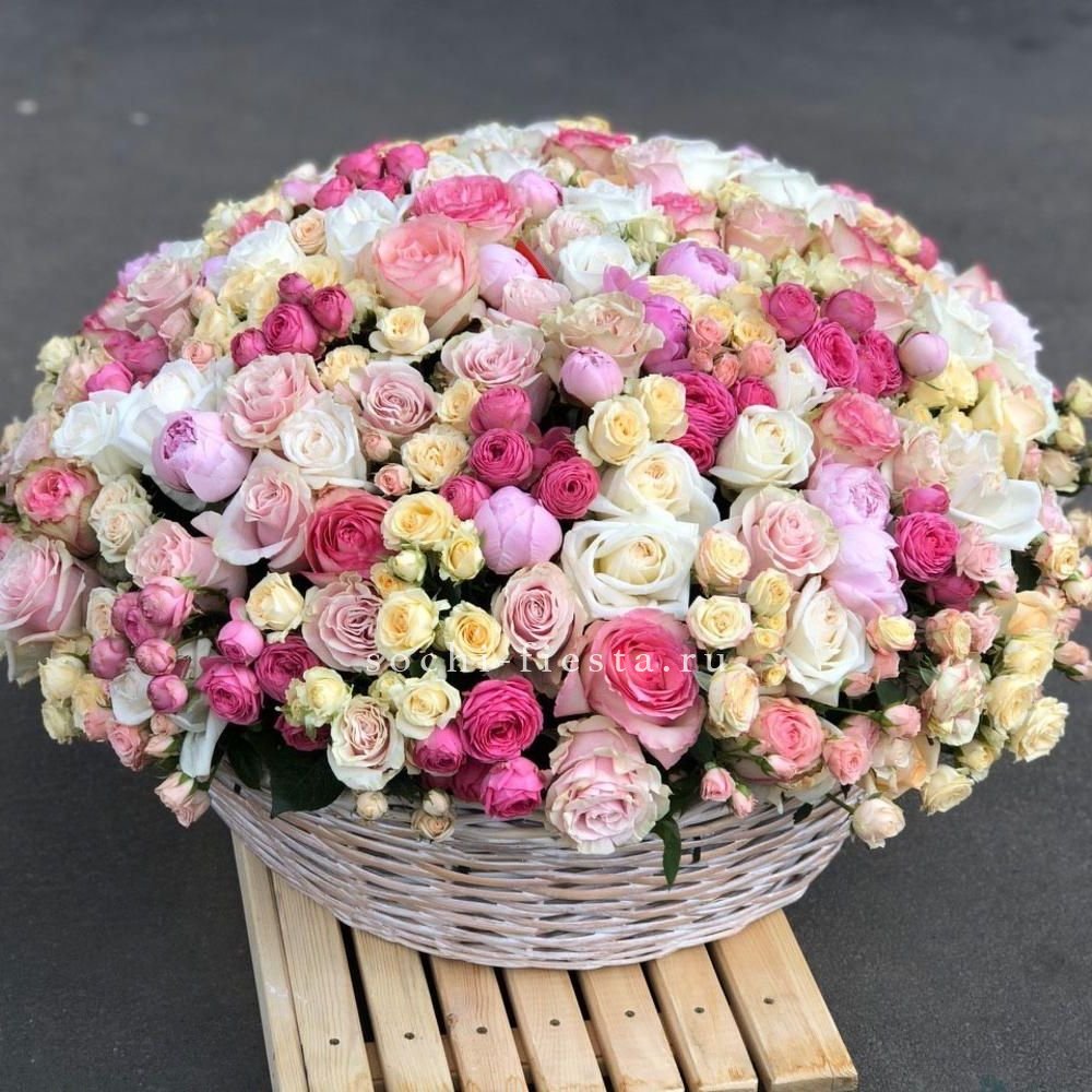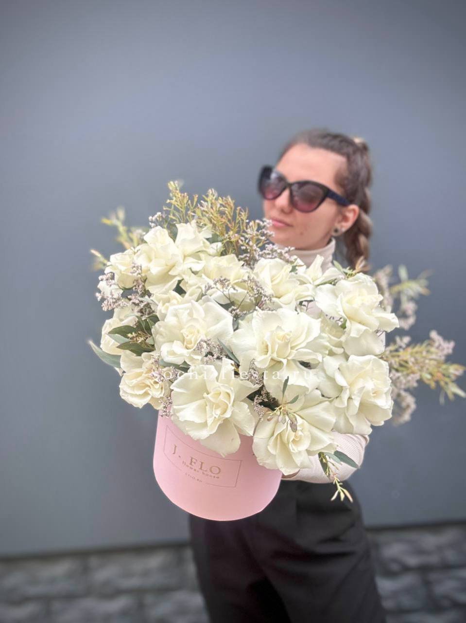 Сочетание пышной голубой гортензии и классических белых роз — это гимн нежности и чистоты. Букет, который не просто удивляет своим масштабом, но и дарит ощущение безмятежности. Идеальный выбор для самого искреннего признания.