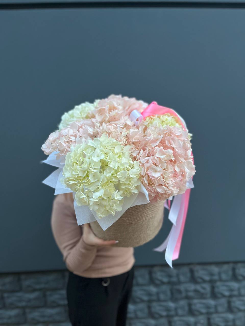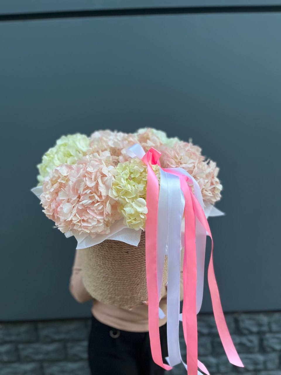 Семь пышных шапок гортензий переливаются от белого к розовому оттенку. Объёмная композиция заполняет собой всё вокруг и притягивает взгляд своей воздушной фактурой.
