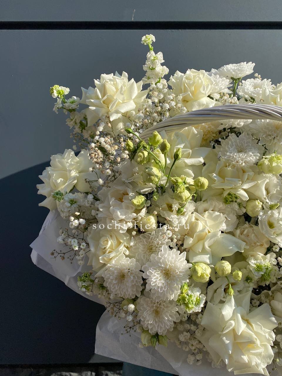 Воздушные шапки гортензий создают объёмную основу, а белые розы добавляют графичности. Голубой оттенок освежает композицию и делает её запоминающейся.