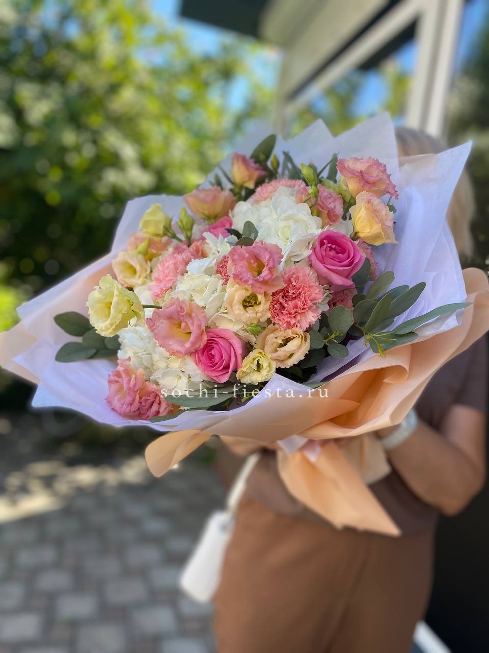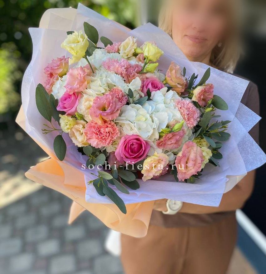 гортензия, розовые пионы Сара Бернар, розы белые, эустома, маттиола (замена вне сезона), эвкалипт, лента, дизайнерская упаковка.