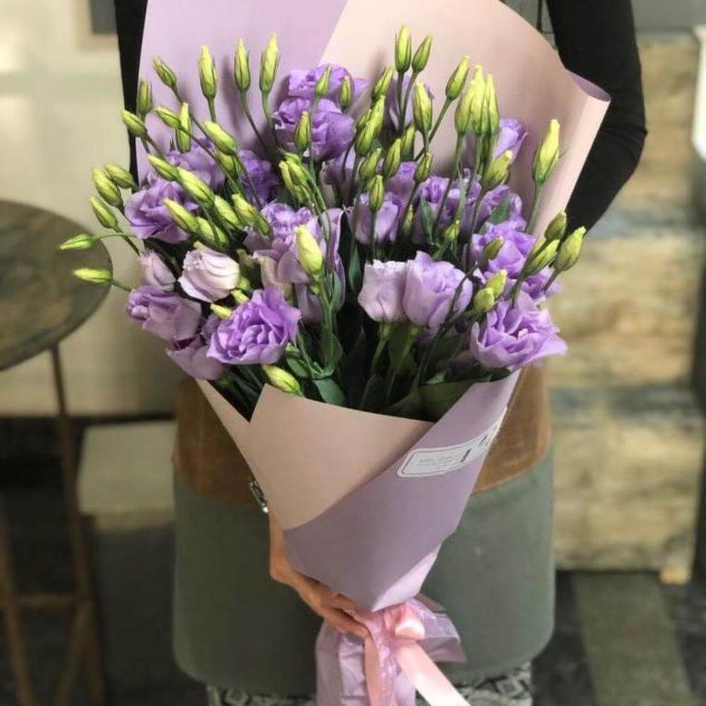 эустома - 21 шт., лента, упаковка фоамиран. Изначальная цена указана за букет Мини эустом- 7 шт.  Стандарт: 21 шт. эустомVIP: 41 шт.