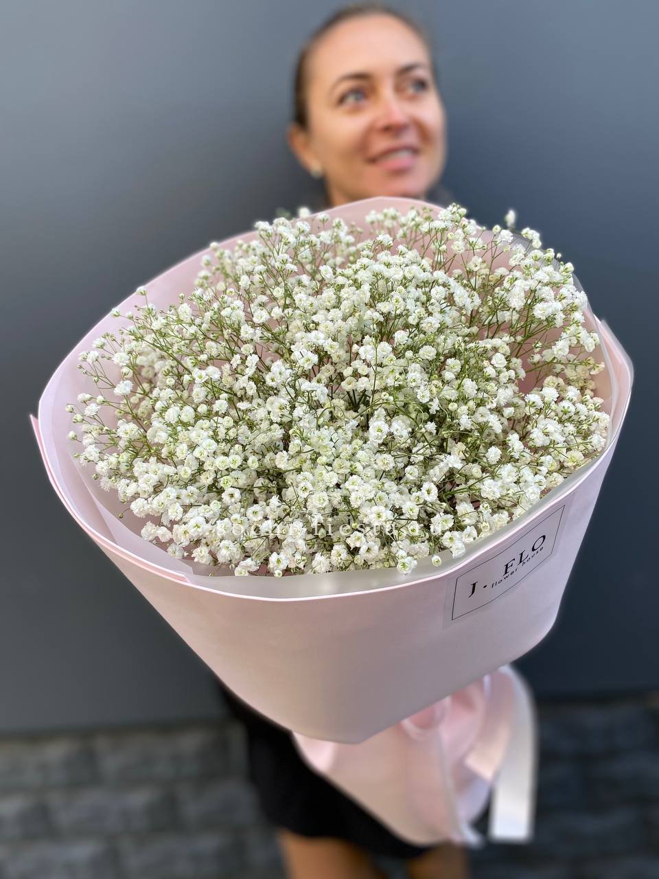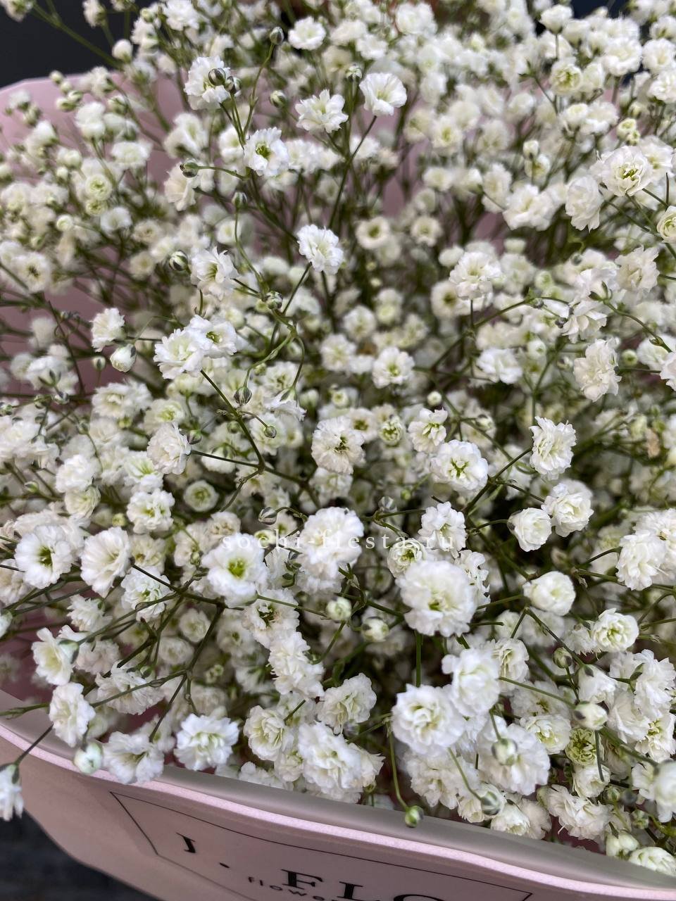 Одиннадцать веток гипсофилы с мелкими соцветиями в комбинированной упаковке из фоамирана. Белые облачка цветов сохраняют форму и долго радуют глаз.