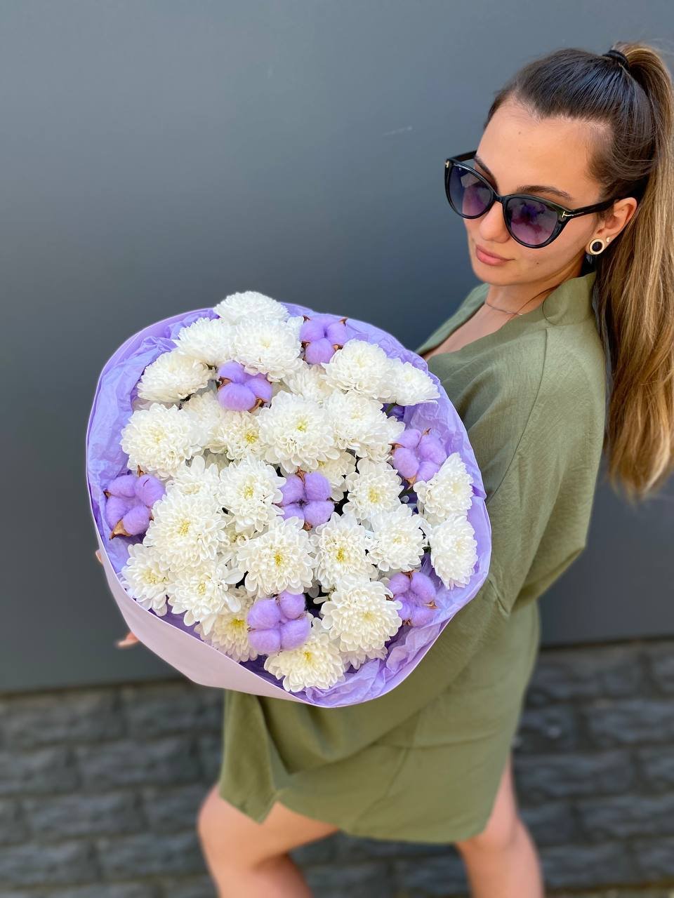 Пять веток кустовой хризантемы с множеством соцветий создают пышную воздушную массу. Букет напоминает утренний сад, где каждая ветка живёт своим ритмом и дарит ощущение лёгкости.
