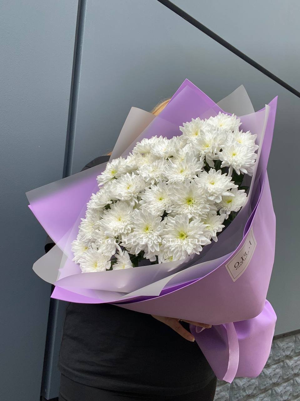 хризантема одноголовая - 9 шт., хамелациум, 5-7 шт., лента, дизайнерская упаковка.