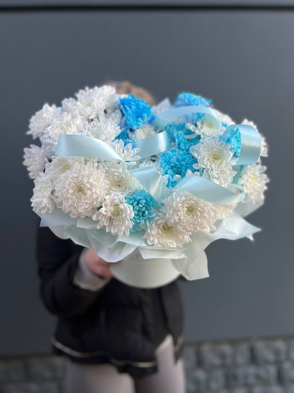 Пятнадцать веток кустовой хризантемы образуют пышное облако из множества соцветий. Каждая ветка раскрывается по-своему, создавая живую текстуру и объёмный силуэт букета.