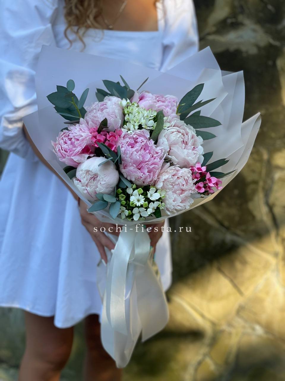 Семь розовых пионов в окружении эвкалипта и бувардии. Зелень добавляет букету воздушности, а плотные бутоны Сары Бернар создают визуальный центр композиции.