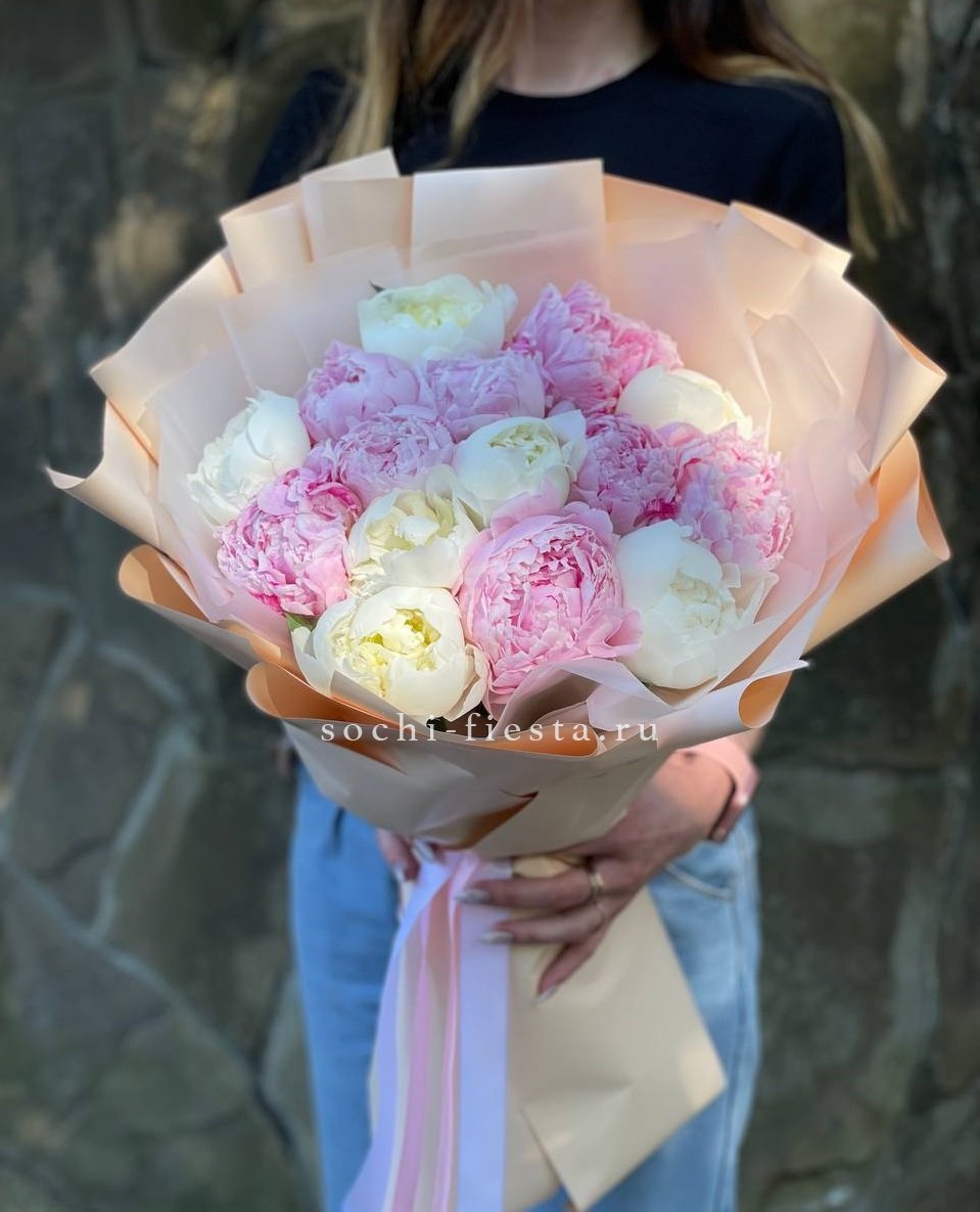 15 пионов, лента, дизайнерская упаковка.