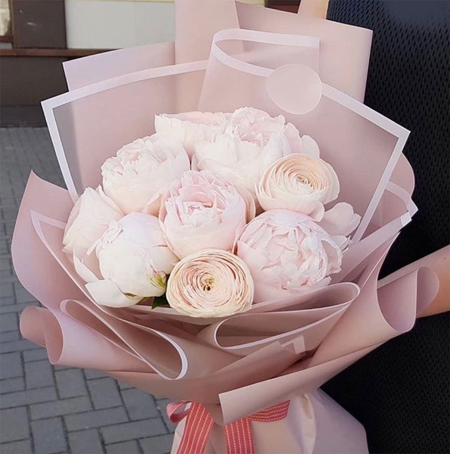 Пионы и ранункулюсы создают игру объемов: крупные шары соседствуют с плотными многослойными розетками. Дизайнерская упаковка завершает композицию.