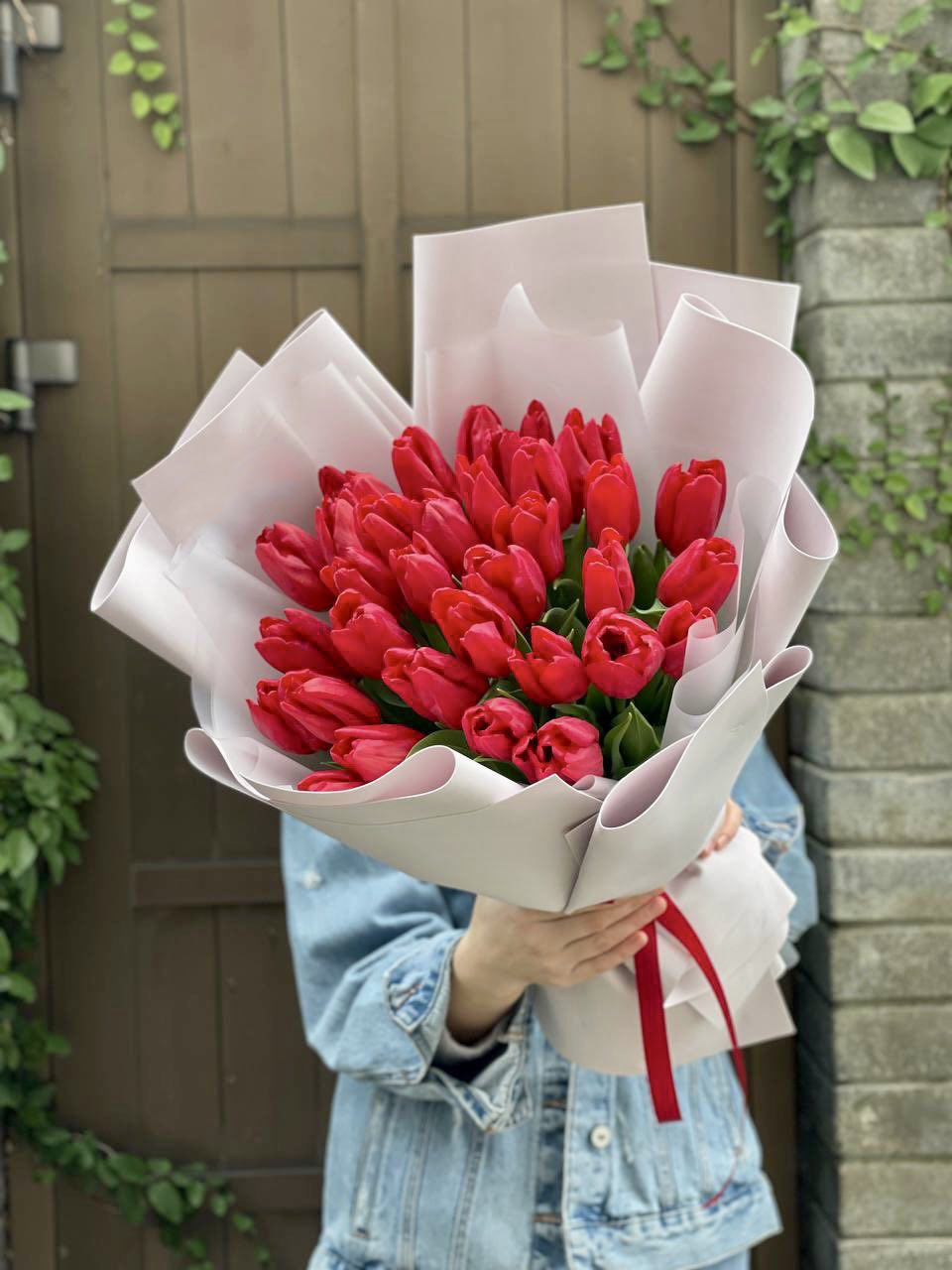 39 сиреневых тюльпанов, лента, дизайнерская пленка или крафт.