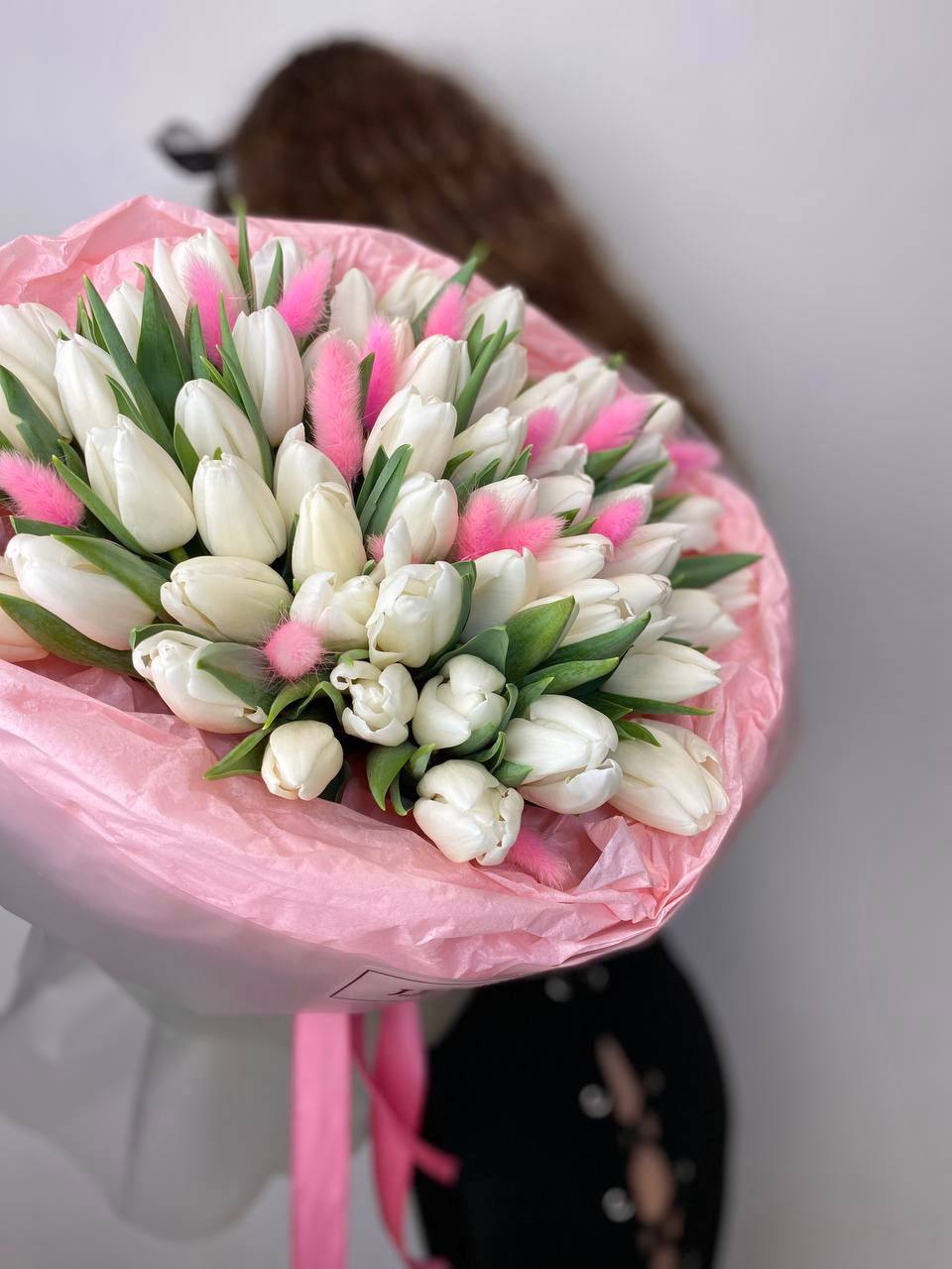 Пятьдесят один белоснежный тюльпан собран в плотный монохромный букет с мягкими соцветиями лагуруса. Чистая графика весенних бутонов создает ощущение свежести и простора.