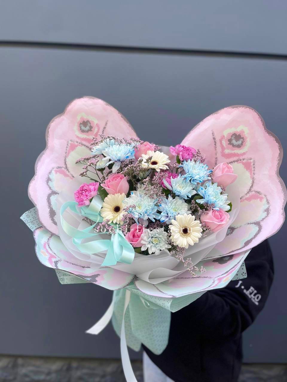голубая хризантема, розовые розы, герберы, диантусы, лимониум, лента и дизайнерская упаковка бабочка.