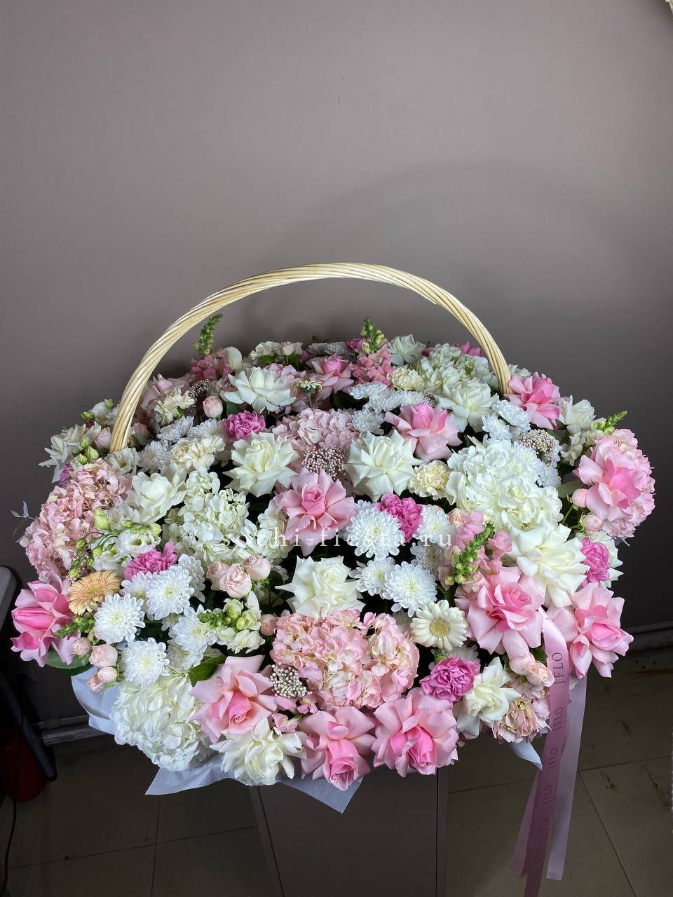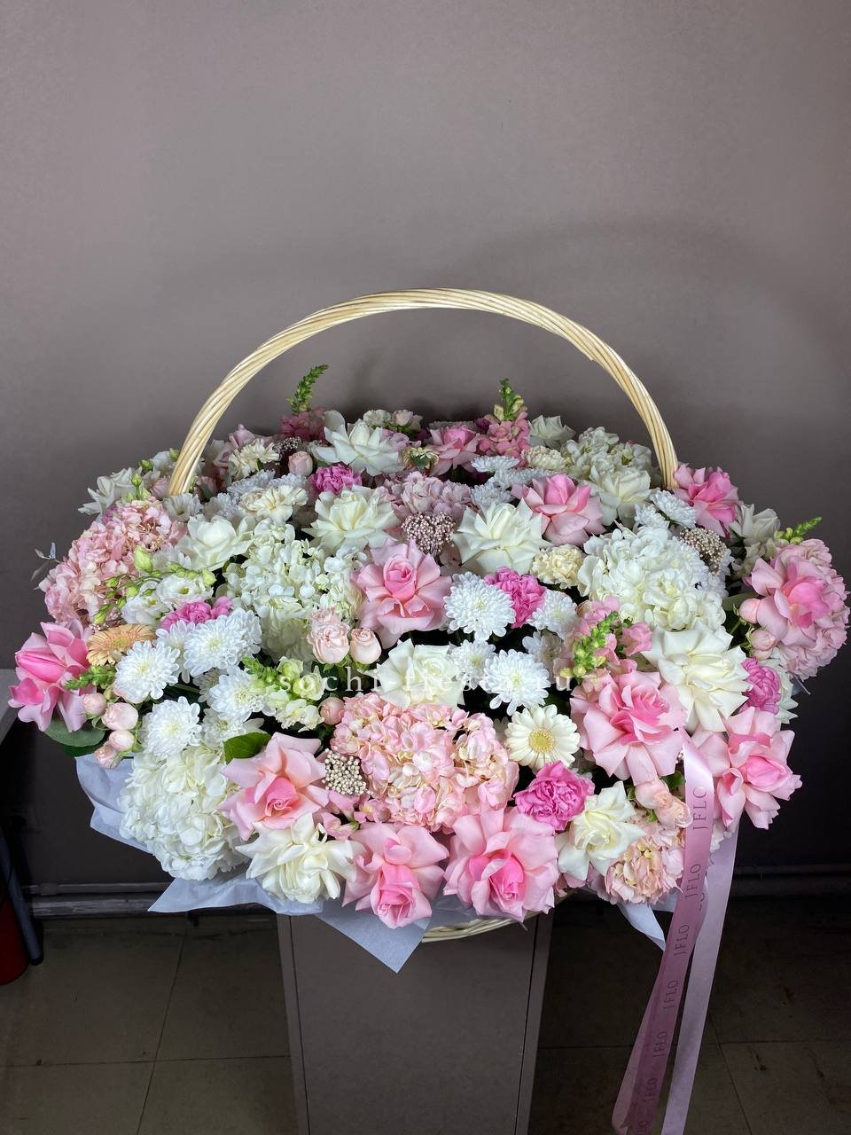 гортензия, розы, пионовидные кустовые розы, эутстома, листья монстеры (или стрелиции), озотамнус, декоративная зелень, дизайнерское оформление.