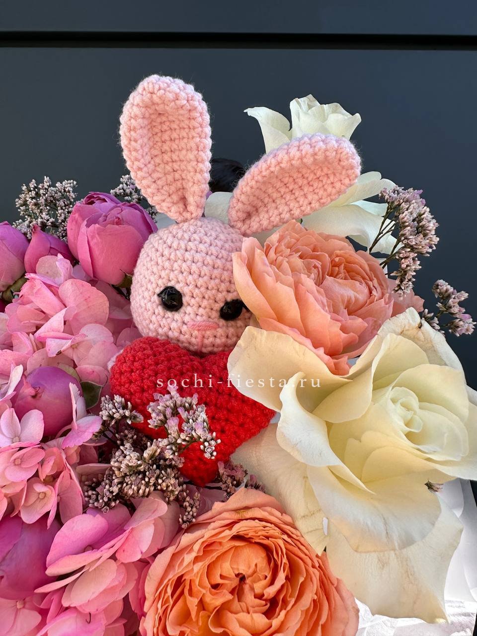Композиция в цилиндре объединяет одноголовые и кустовые розы с пышной гортензией. Лимониум добавляет воздушности. Мягкая игрушка завершает образ.