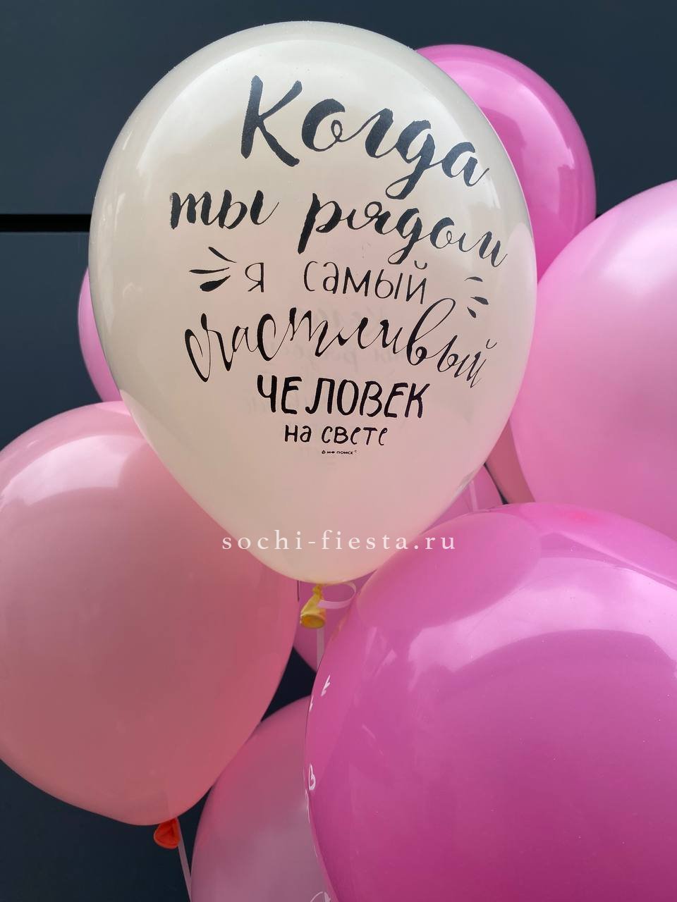 Двенадцать шаров с разными признаниями собраны в лёгкую воздушную группу. Каждая надпись читается отдельно и создаёт личное послание. Простая форма и понятный язык без лишних деталей.