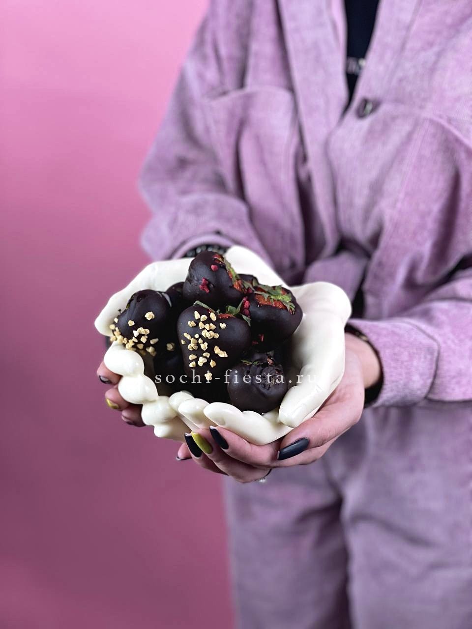 Свежая клубника в бельгийском шоколаде размещена на ладонях из того же материала с жестом мира. Посыпка из орехов или конфетти добавляет текстурный акцент каждой ягоде.