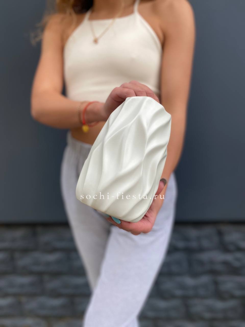 Геометрический рисунок на белой керамике выстраивает графичный ритм по поверхности. Лаконичная форма удерживает внимание за счёт фактурной игры линий и плоскостей.