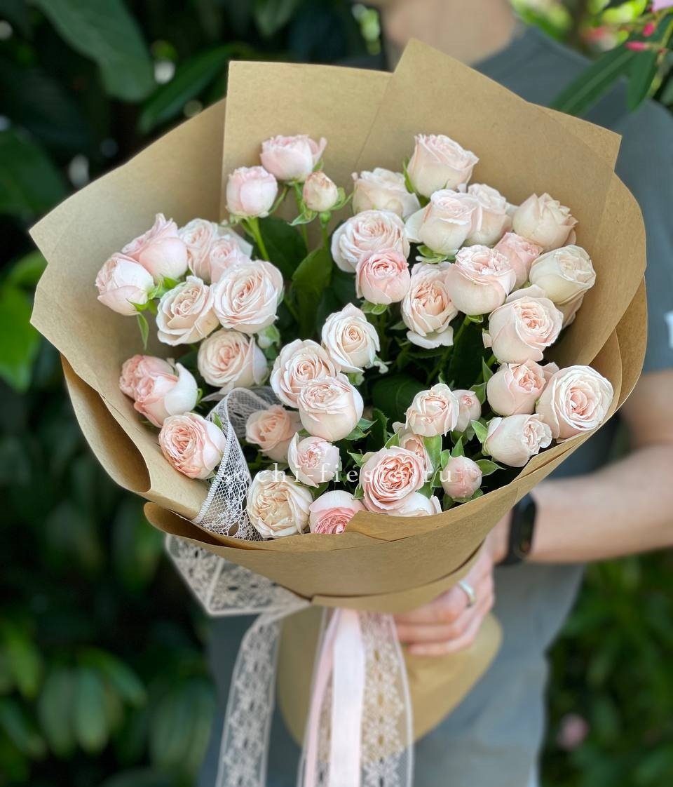 белые и пионовидные розы мисти баблс в нежном оформлении.