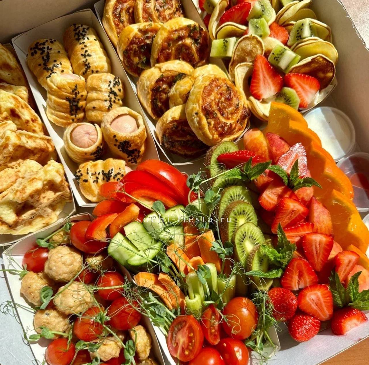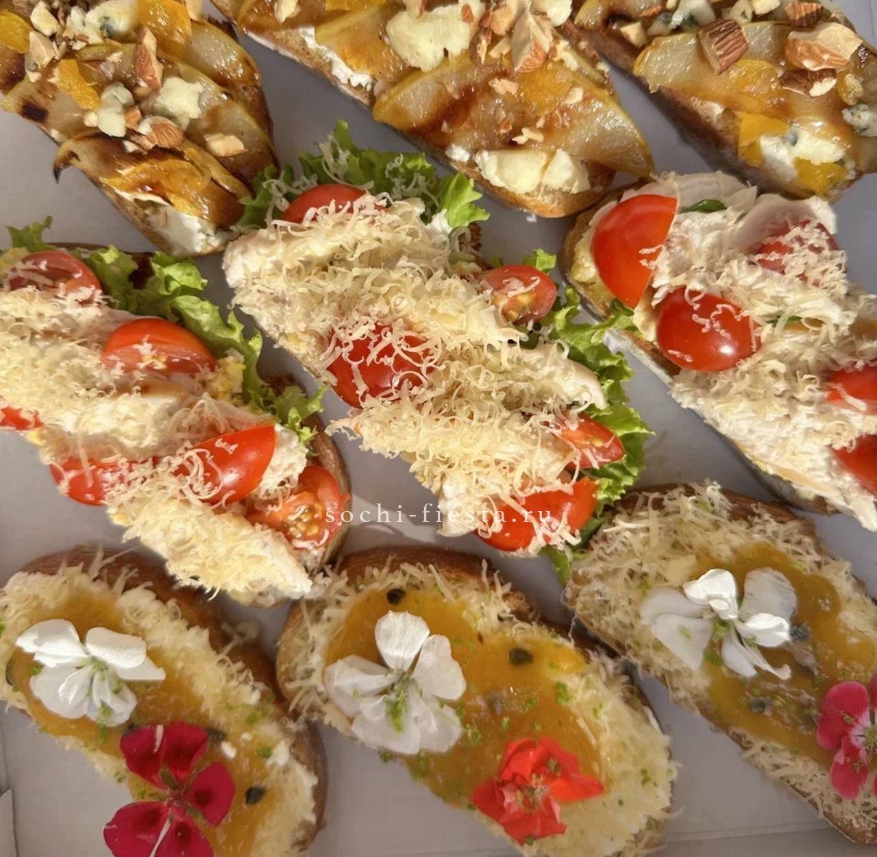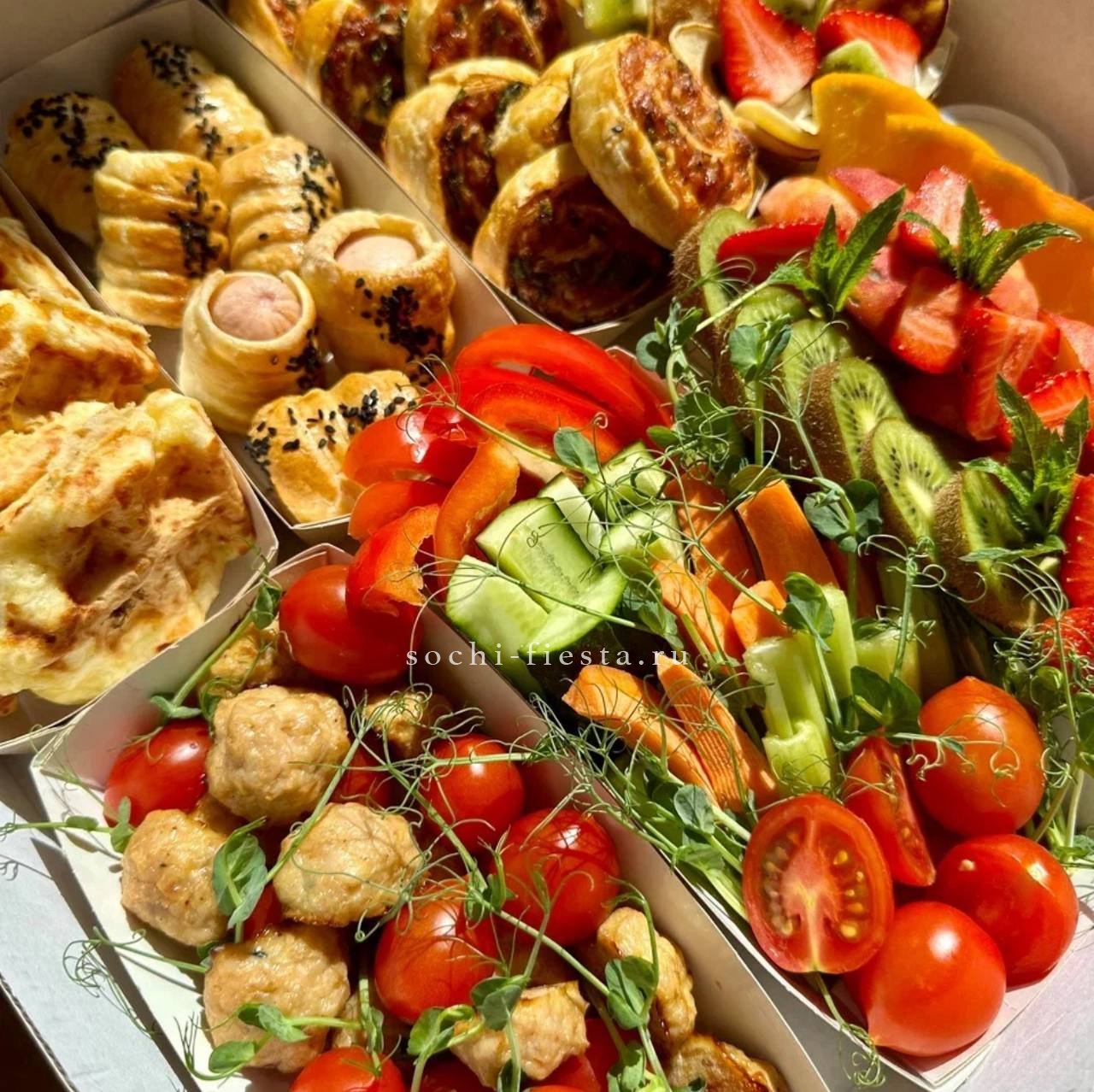 конвертики с овощами и ветчиной- 5 шт. Мини тосты с лососем, редисом и лимоном- 5 шт. Тарталетки с рийетом из лосося- 5 шт. Яйцо в пикантной начинкой из сыра- 5 шт.