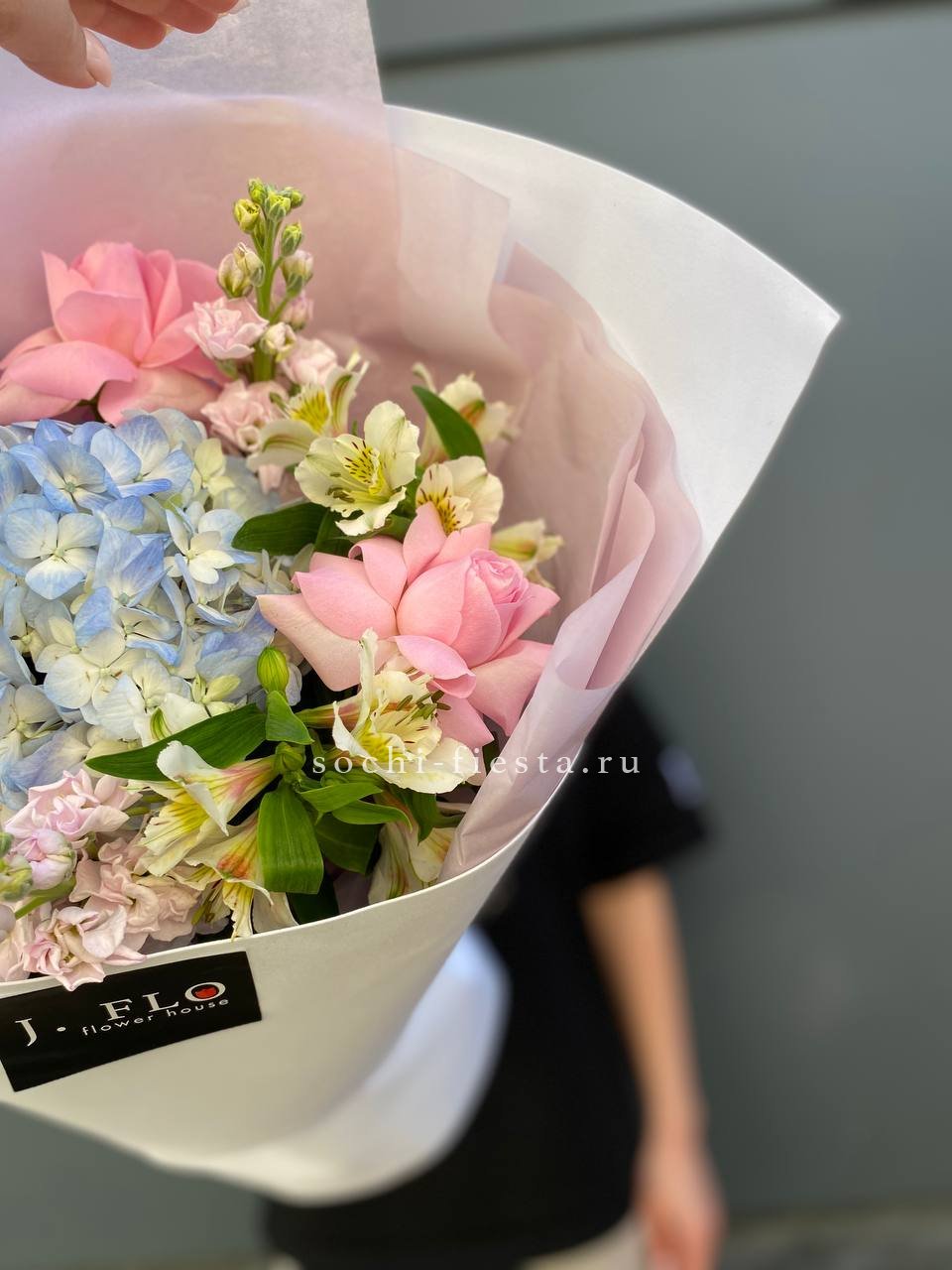 гортензия, диантус, розовые розы, маттиола, эустома, амарант, бусы (возможна замена), джутовое кашпо.