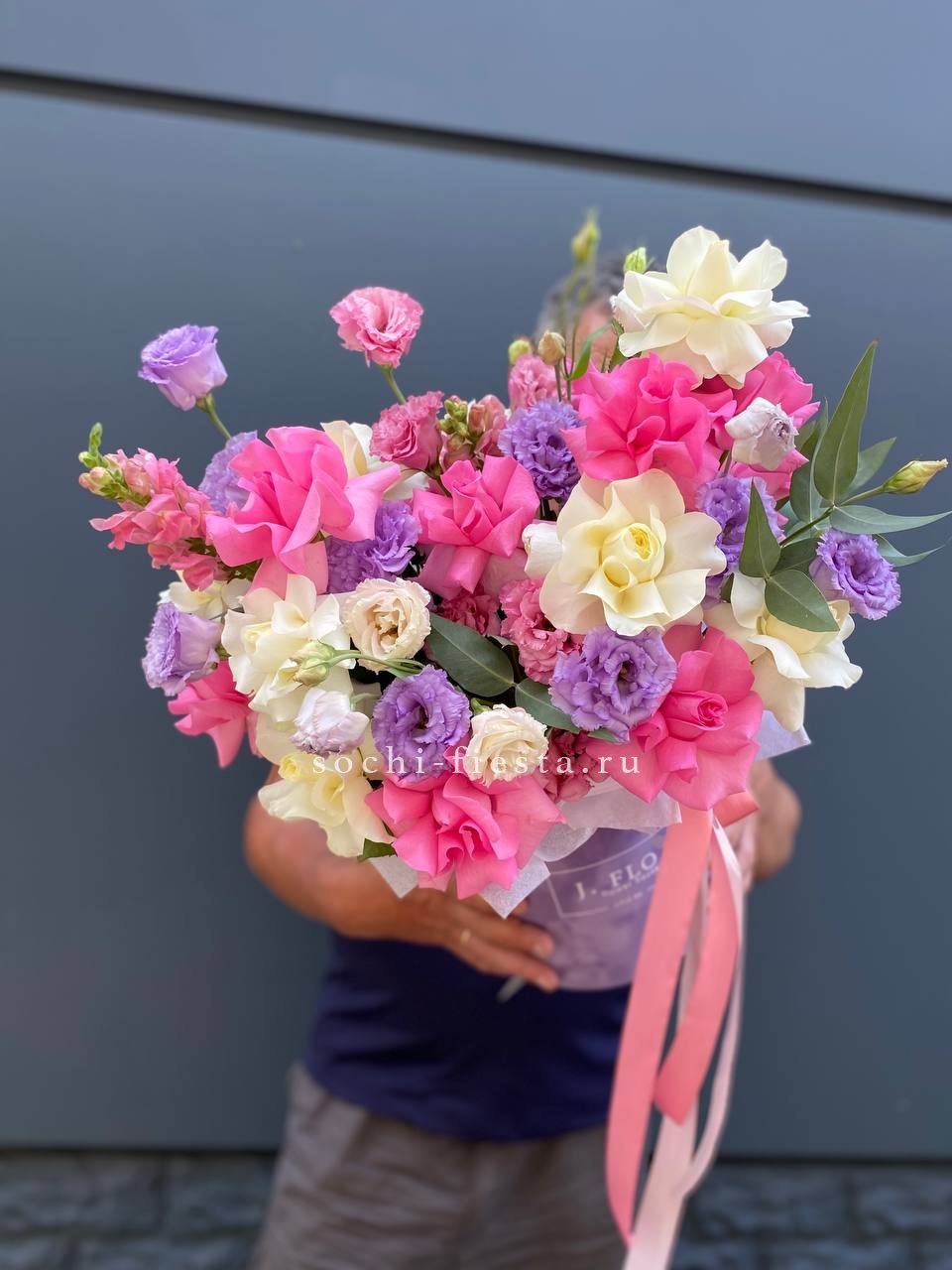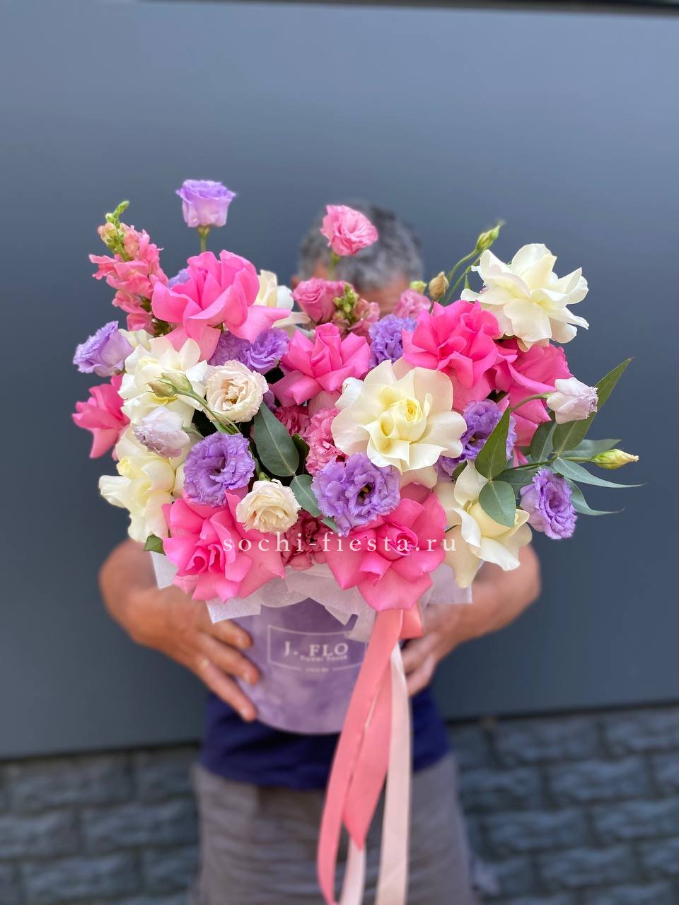 Пышная композиция объединяет розовые оттенки гортензии, роз, маттиолы и эустомы с акцентами диантуса и амаранта. Насыщенная фактура и плавные переходы цвета создают объёмное живописное полотно в натуральном кашпо.