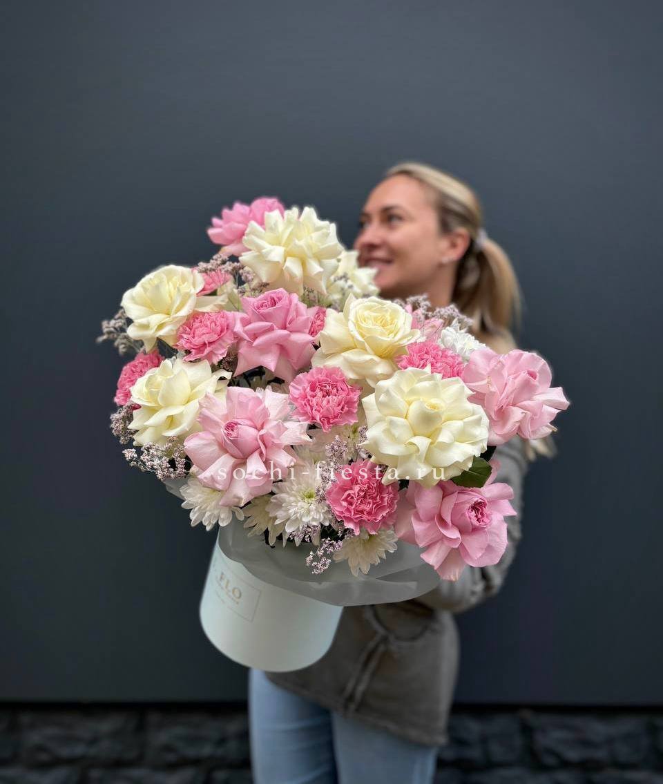 Для заказа товара "Коробка французских роз и диантусов "Бони"" с доставкой в Волгограде нажмите в корзину