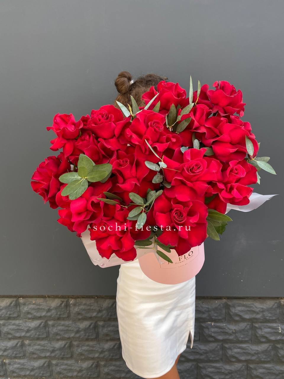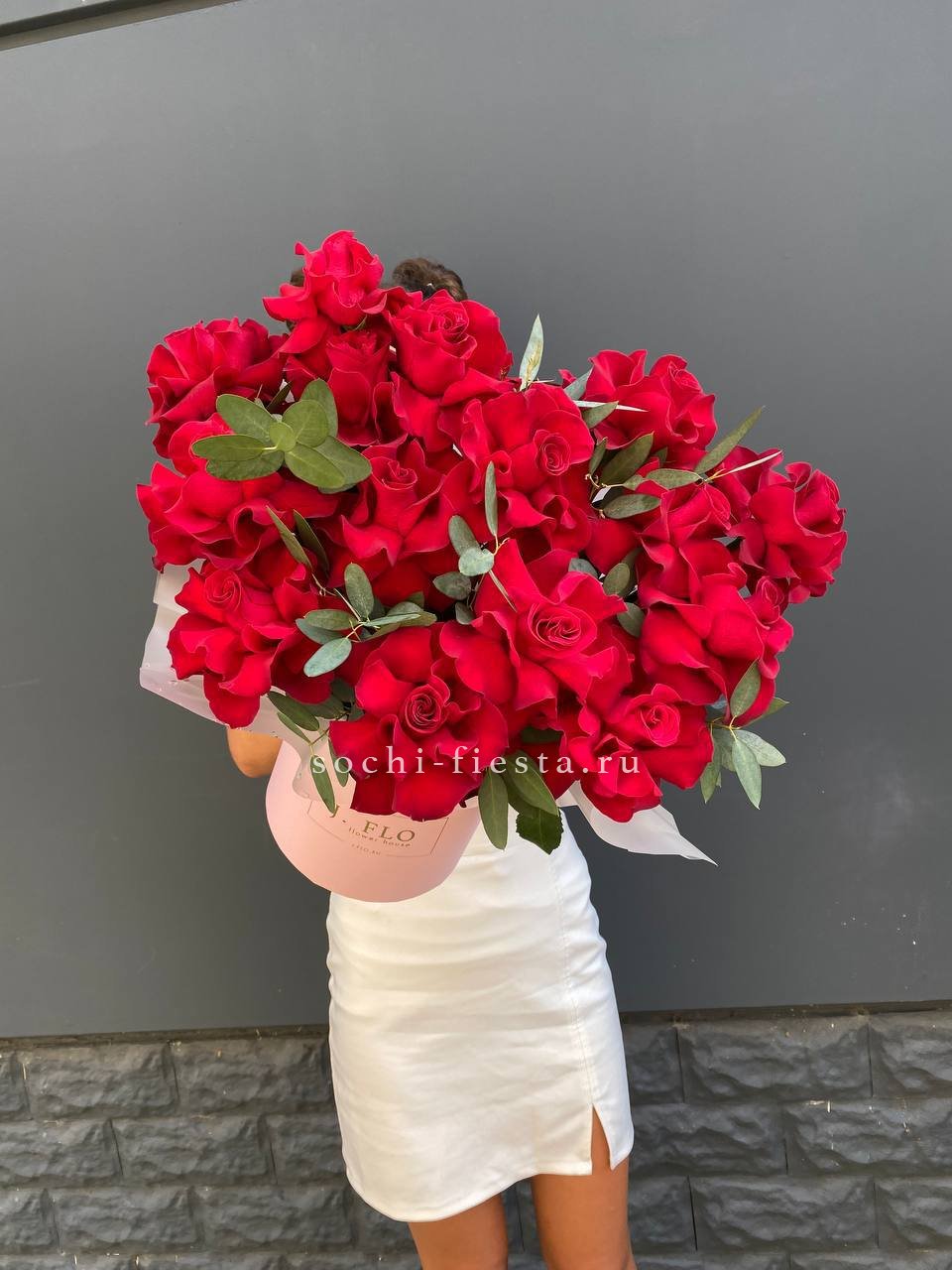 Пятьдесят пять бутонов глубокого красного оттенка собраны в плотную графичную форму. Квадратная коробка задает четкий ритм и усиливает насыщенность цвета.