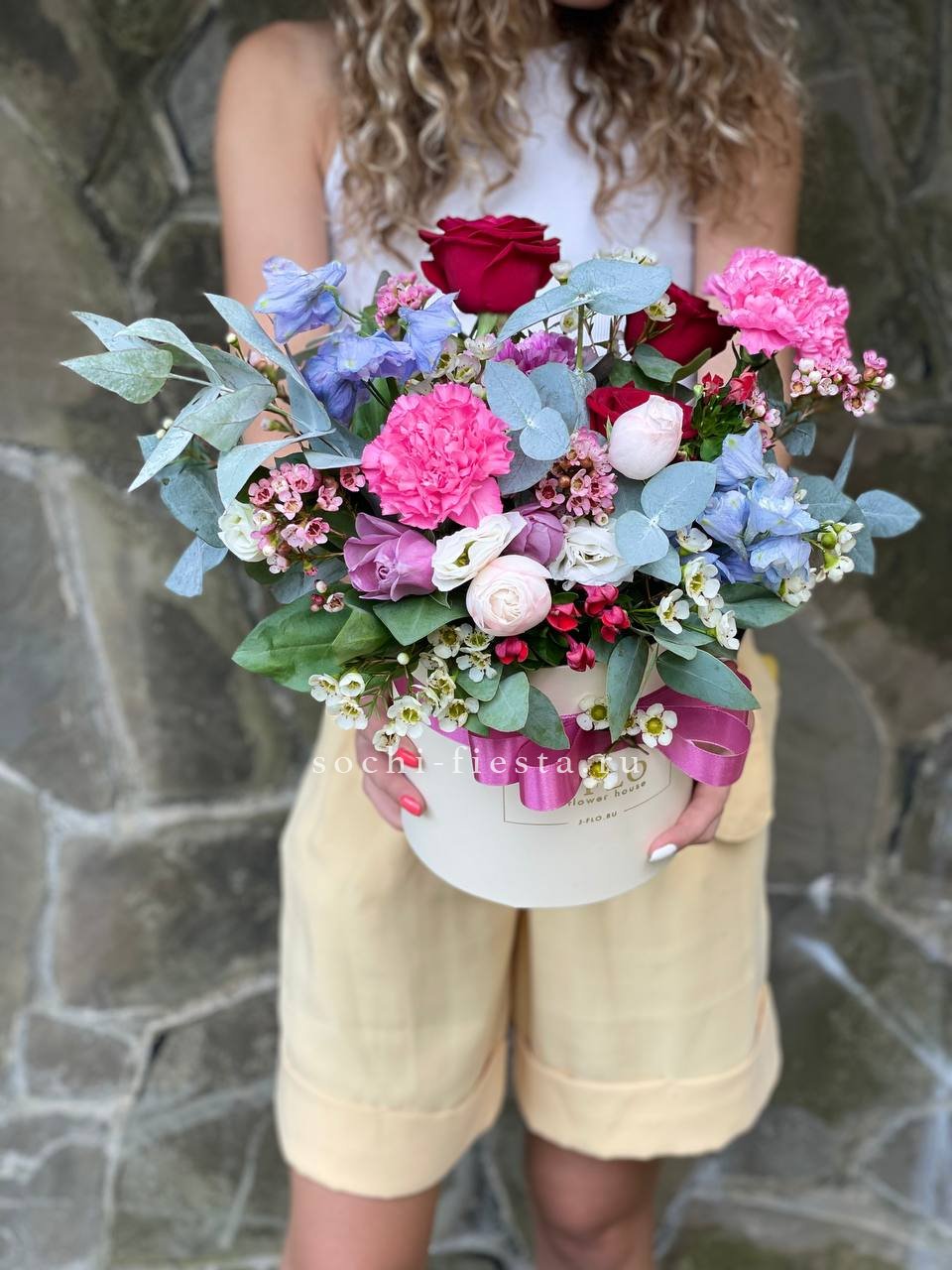 Белоснежные розы и воздушная эустома соседствуют с пышной гортензией и яркими вспышками статицы. Композиция собрана плотно, каждый цветок находит своё место в общем ритме.