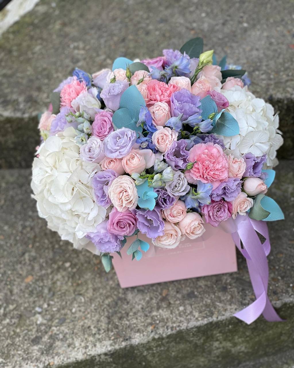гортензия, эустома, диантусы, розы, эвкалипт и прочие цветы, гармонирующие по фактуре. Цветочная композиция в белых, нежно-сиреневых, розовых тонах в квадратном боксе D25.