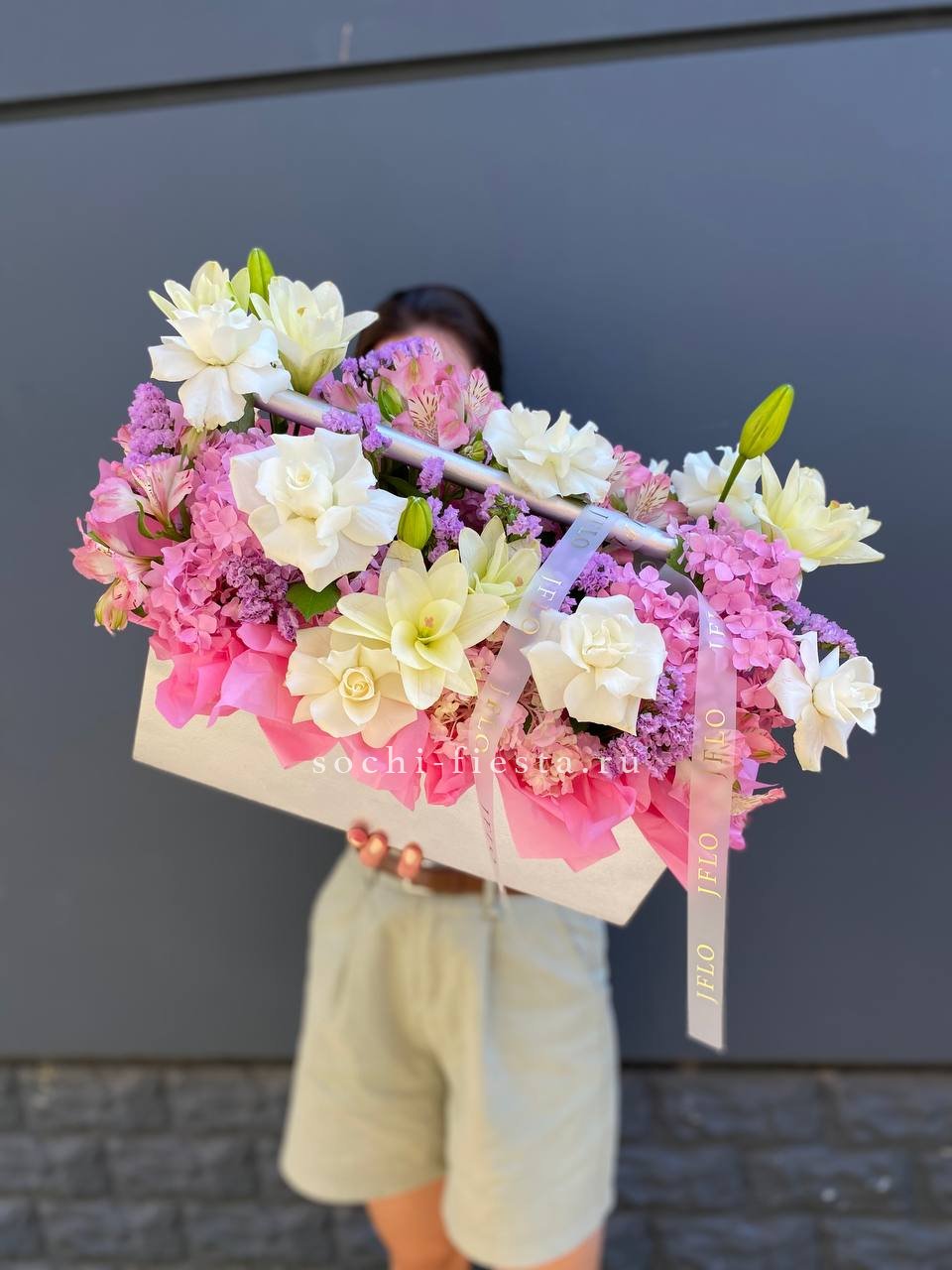 лилии, французские розы, гортензия, альстромерия, статица,деревянный ящик.