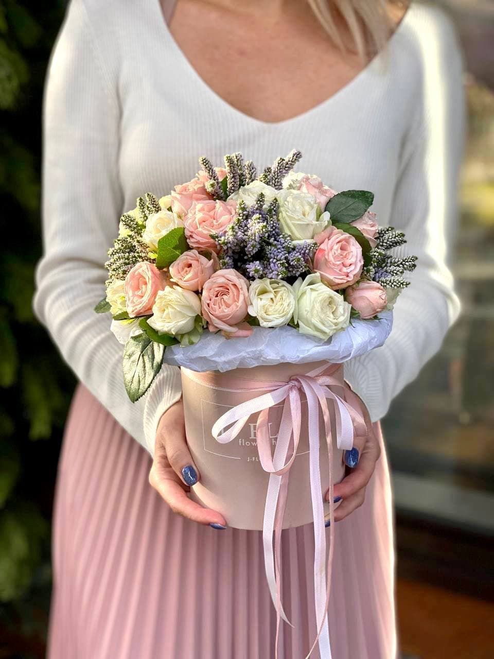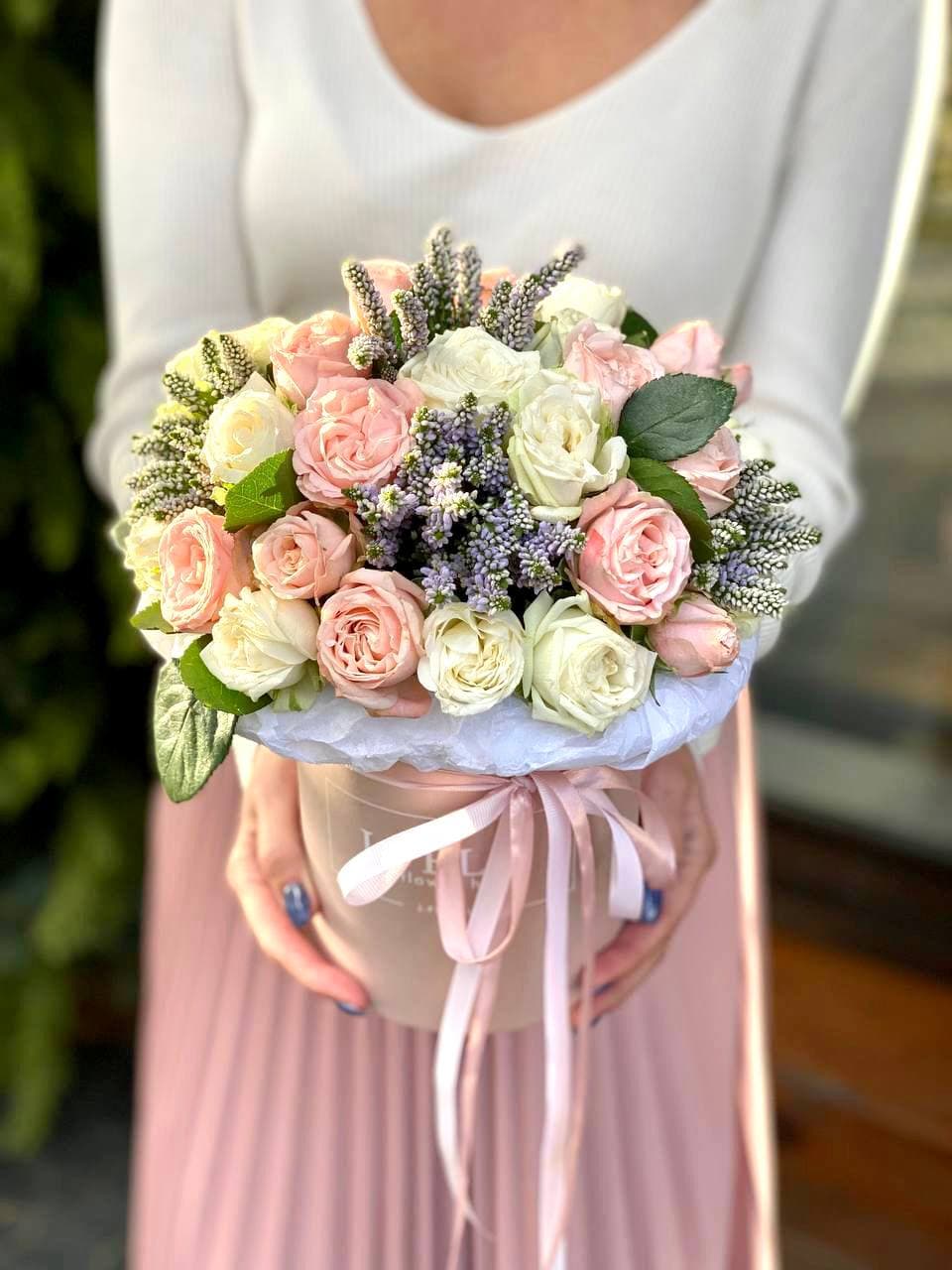 розы, альстромерии, хризантемы, диантусы, цилиндр D13,оазис, тишью.