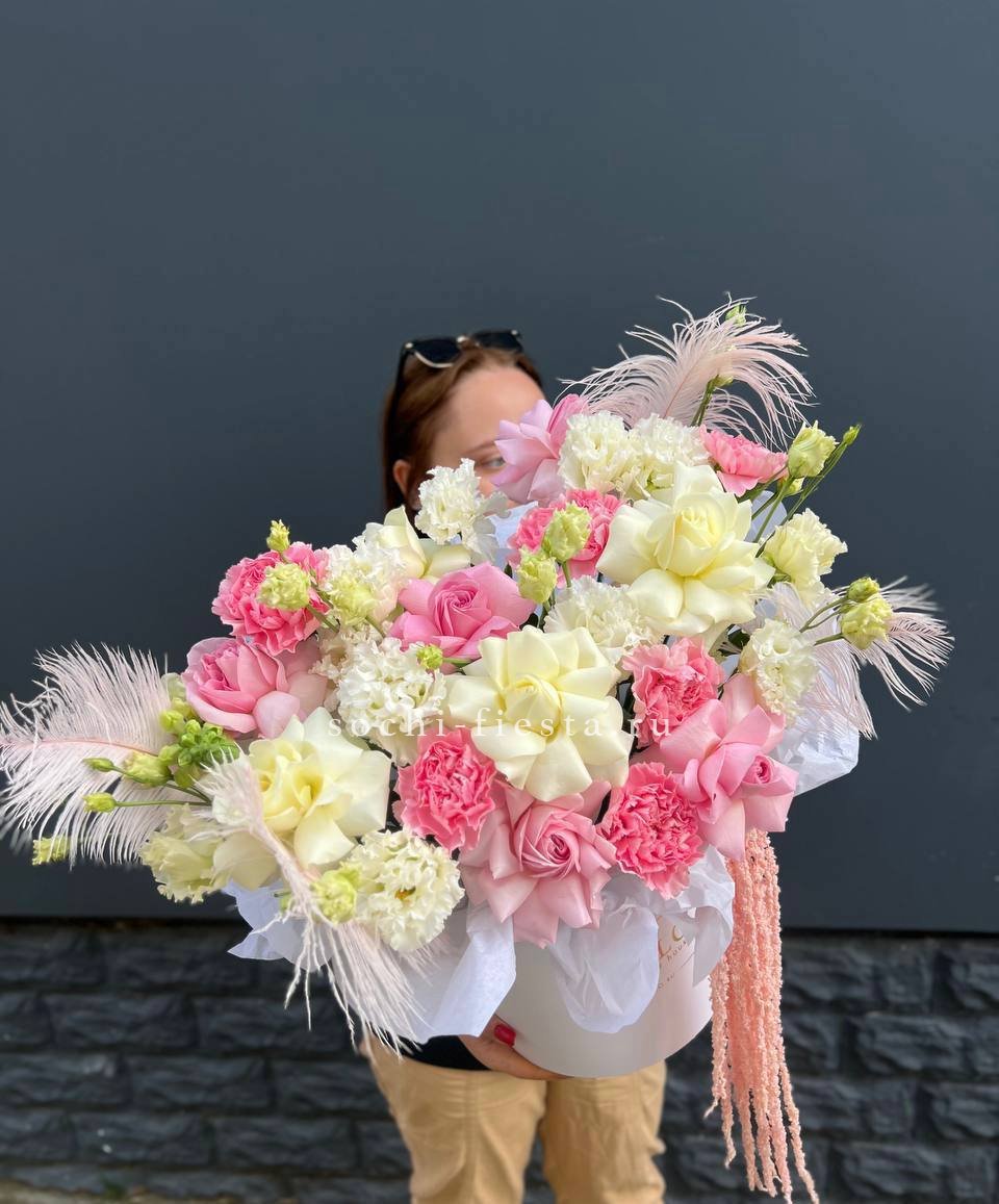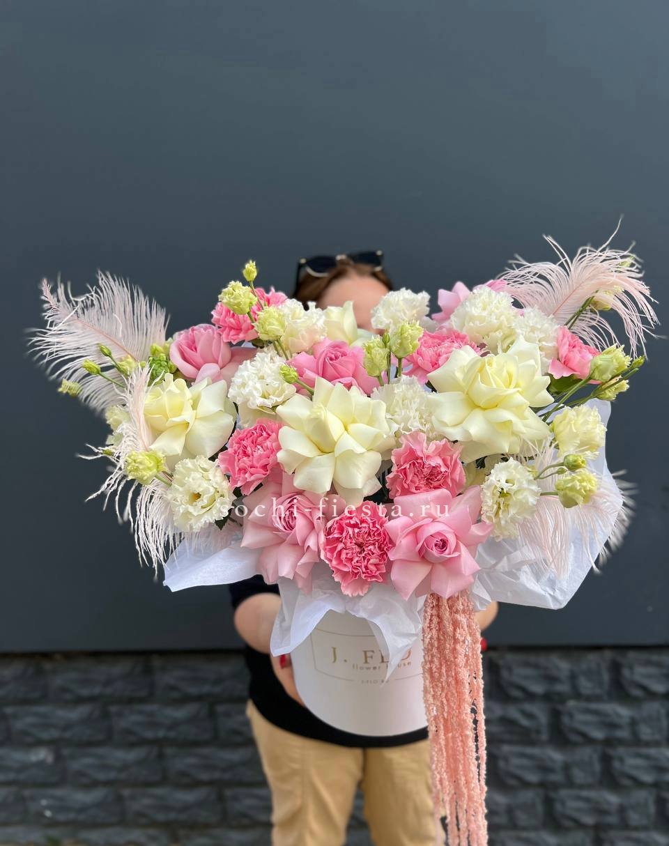 гортензия, розы, озотамус, диантус, бомбастик, хлопок, хризантема бокс 16.