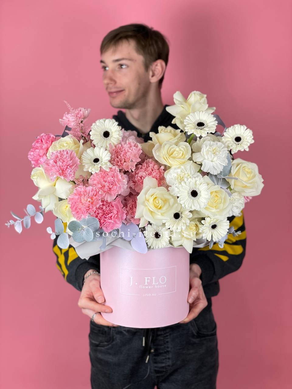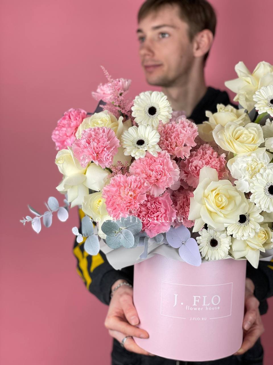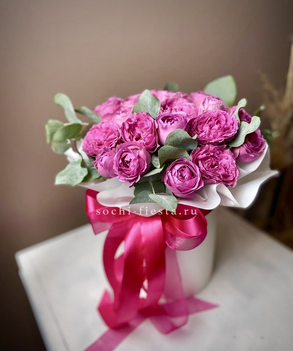 Пионовидные бутоны и шапки гортензии заполняют бокс густой textured массой. Композиция держит форму и создаёт ощущение цветочной волны в ограниченном пространстве.