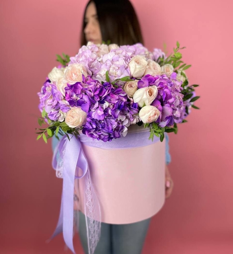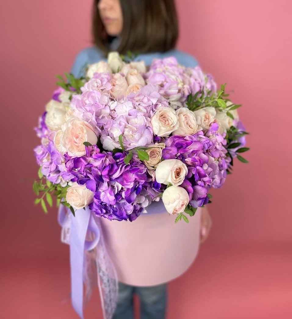 гортензия, одноголовые розы, пионовидные розы, диантусы, лента, цилиндр D20.