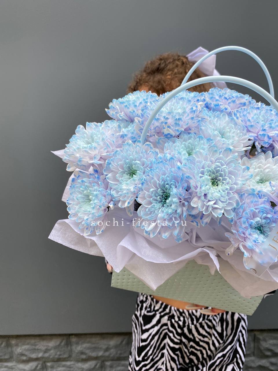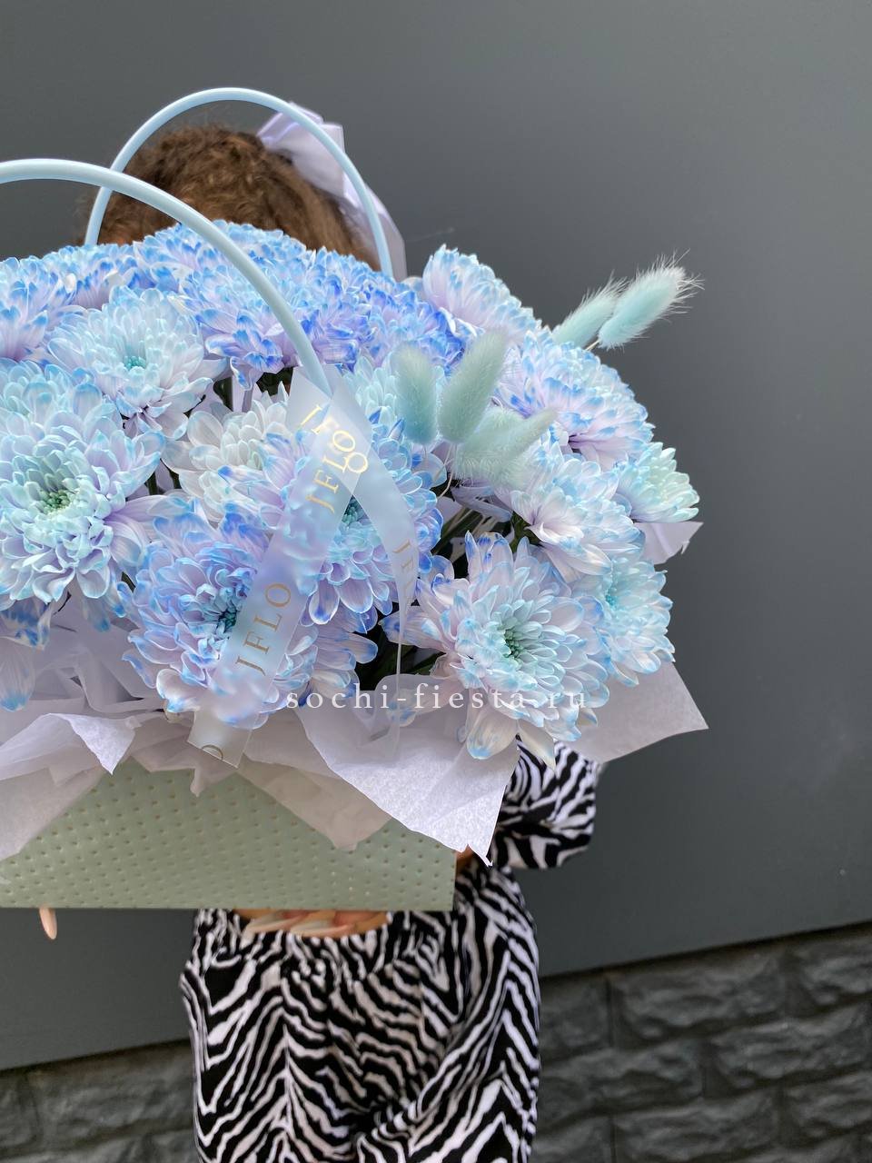 Голубая хризантема в компании воздушного лагуруса напоминает о прохладе летнего утра. Компактная форма в сумочке позволяет разместить цветы на столе или полке без лишних усилий.