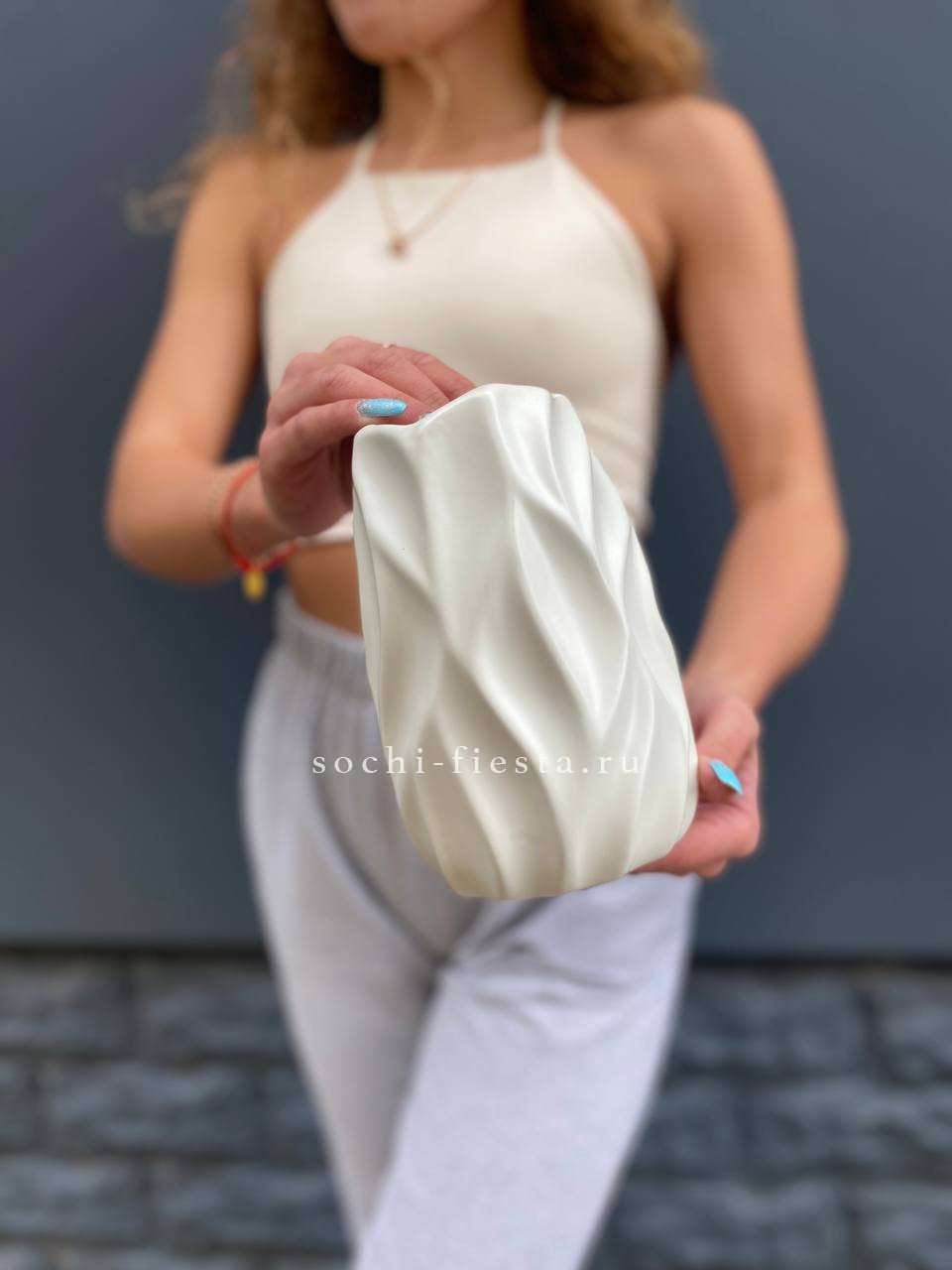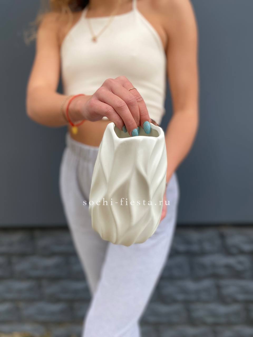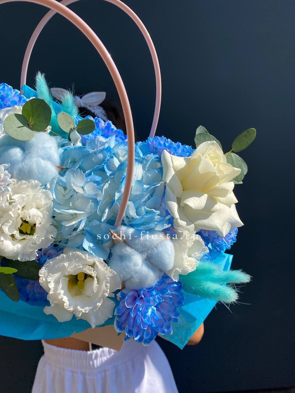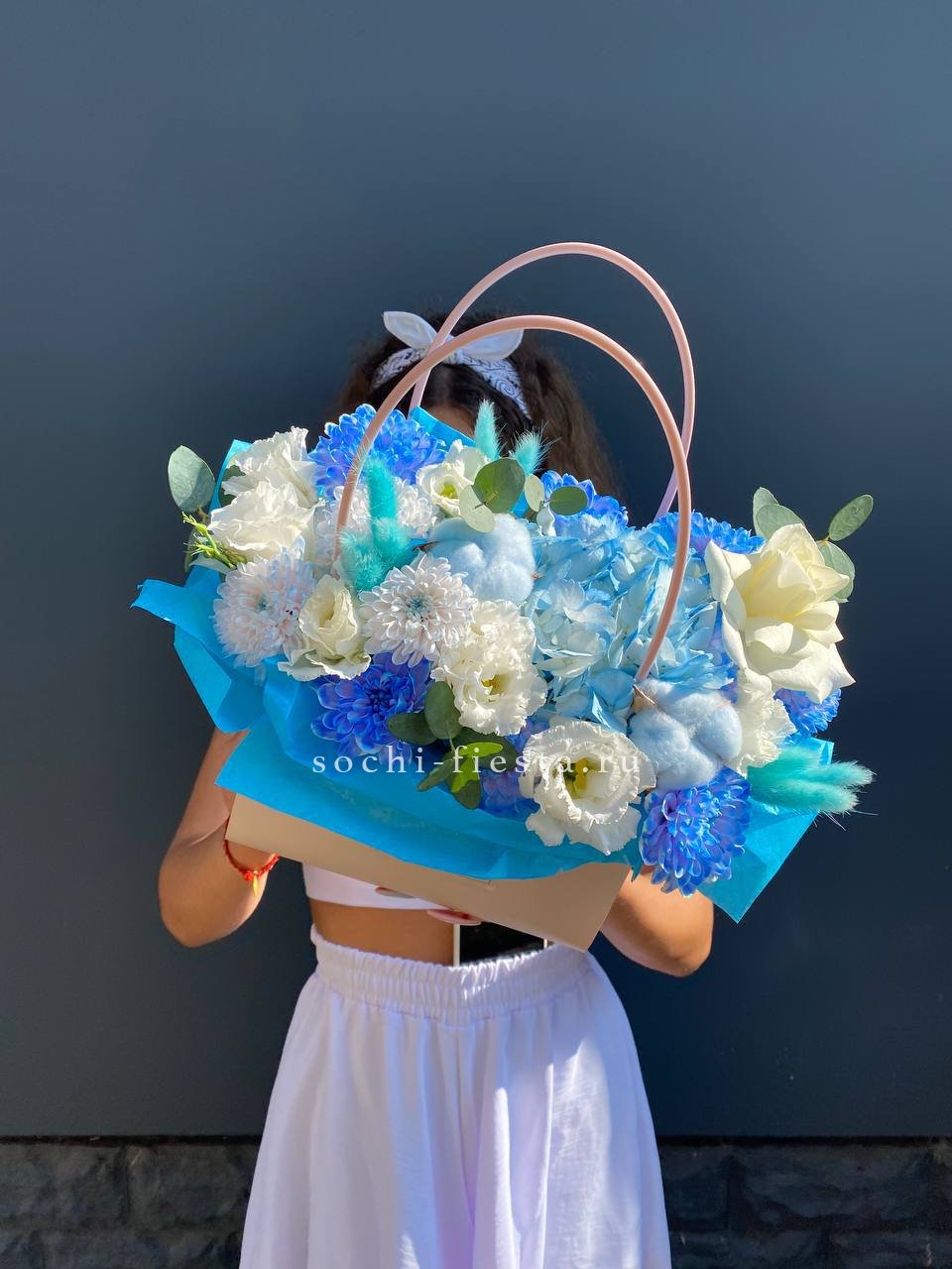 хризантема голубая, лагурус, сумочка.
