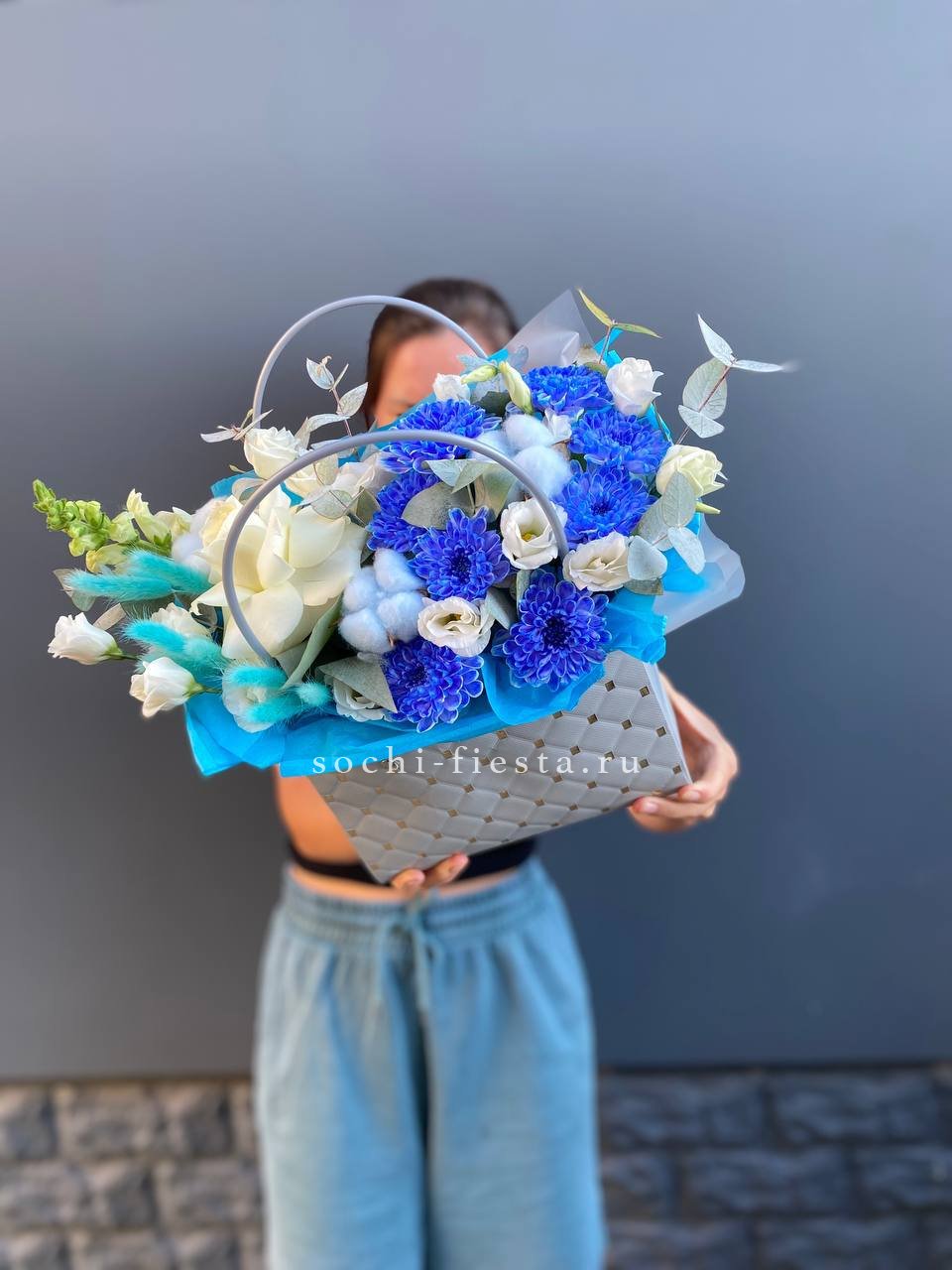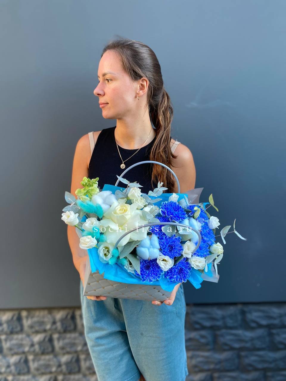 Сумочка Florence дарит ощущение солнечного утра. Альстромерии и розовые розы собраны в легкую композицию с добавлением хлопка и диантусов. Удобная форма позволяет разместить её на столе или подоконнике.