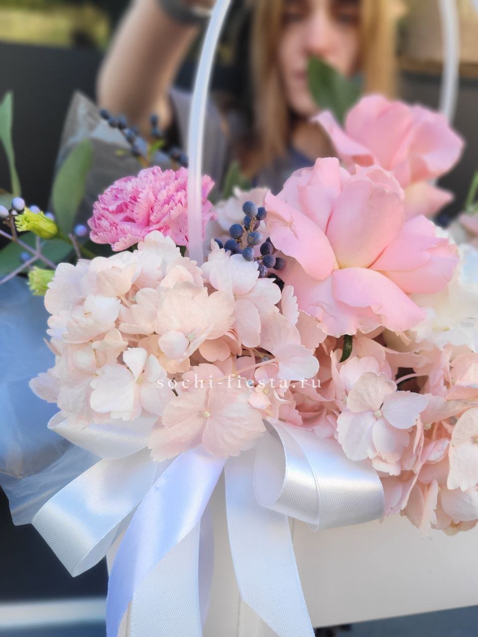нежная композиция на базе оазиса с применением одноголовых роз, эустомы, гортензии, диантусов, эвкалипта, упаковки.