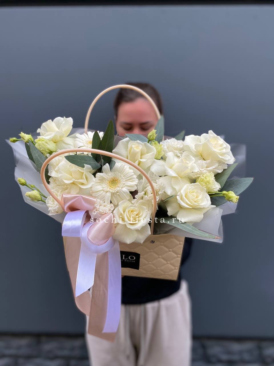 гортензия, розовые розы, эустома, диантусы,эвкалипт, лента, сумка-кашпо.