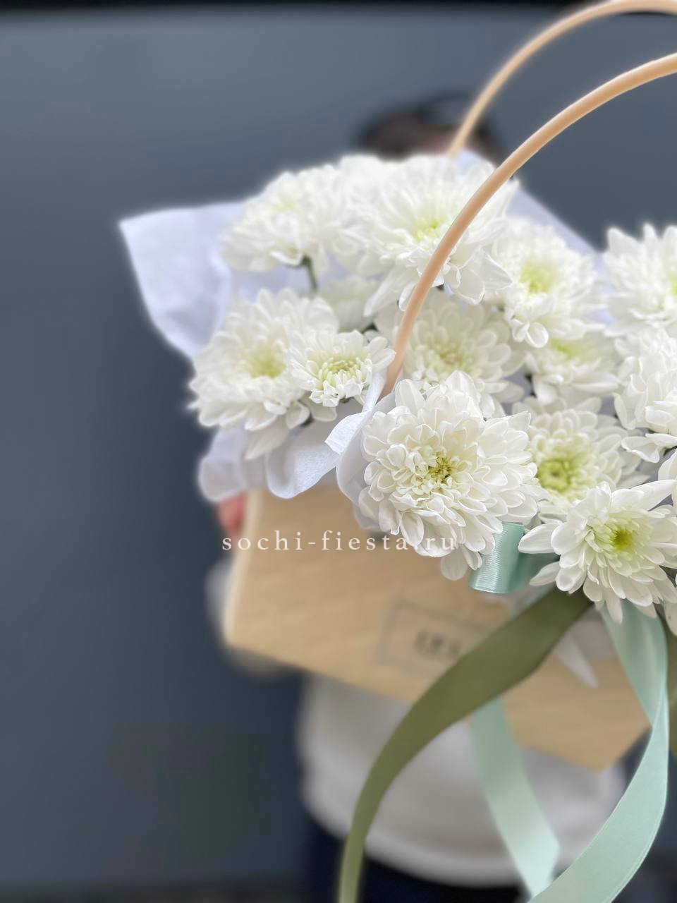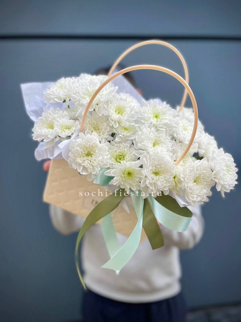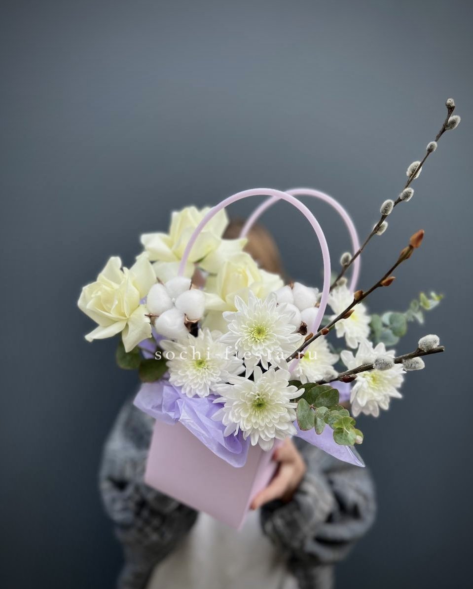 Весенняя композиция в миниатюрной сумочке собрана из хризантем, роз и пушистых веток вербы. Хлопок добавляет мягкости, а эвкалипт освежает общую картину. Компактная форма позволяет разместить её на столе или комоде.