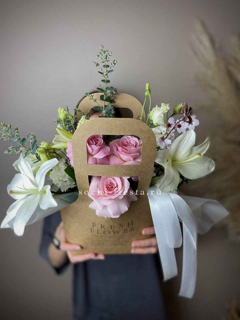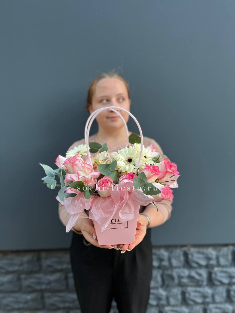 Гортензия создает объемную базу, а герберы и кустовые розы добавляют яркие акценты по всей композиции. Эвкалипт обрамляет сумочку легкими серебристыми ветвями.