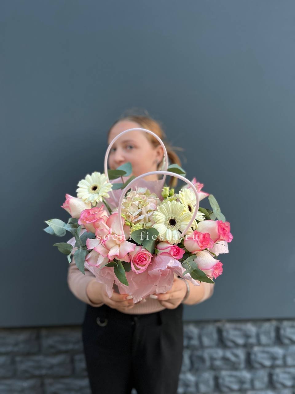сумочка из гортензии, кустовой розы, герберы и эвкалипта.