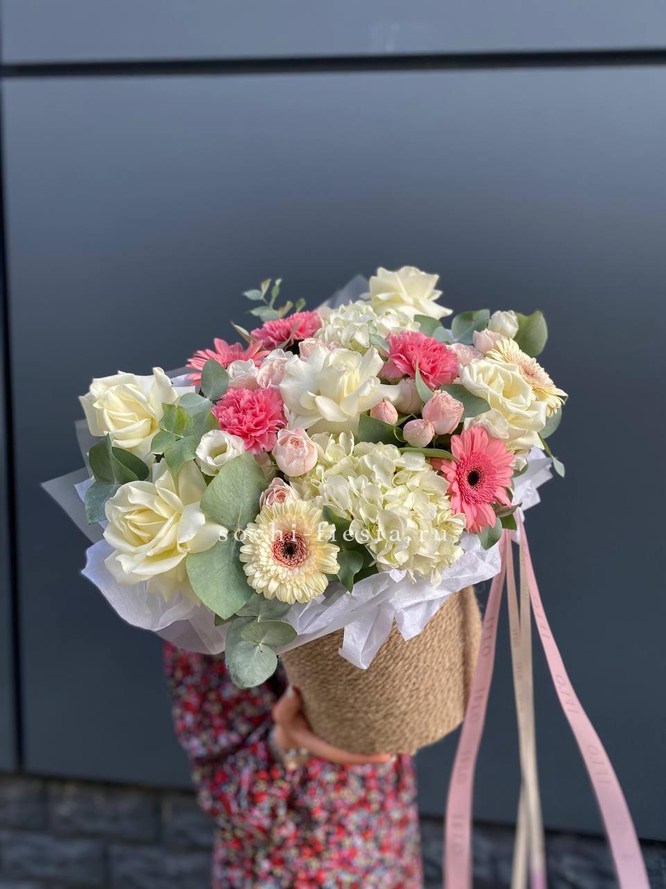 Этот букет создан, чтобы заряжать позитивом! Яркие акценты розовых гербер и теплые оттенки кремовых роз, в обрамлении свежей зелени, создают ощущение солнечного дня и беззаботного счастья. Это не просто цветы, а концентрат радости, который мгновенно поднимет настроение и добавит ярких красок в жизнь.