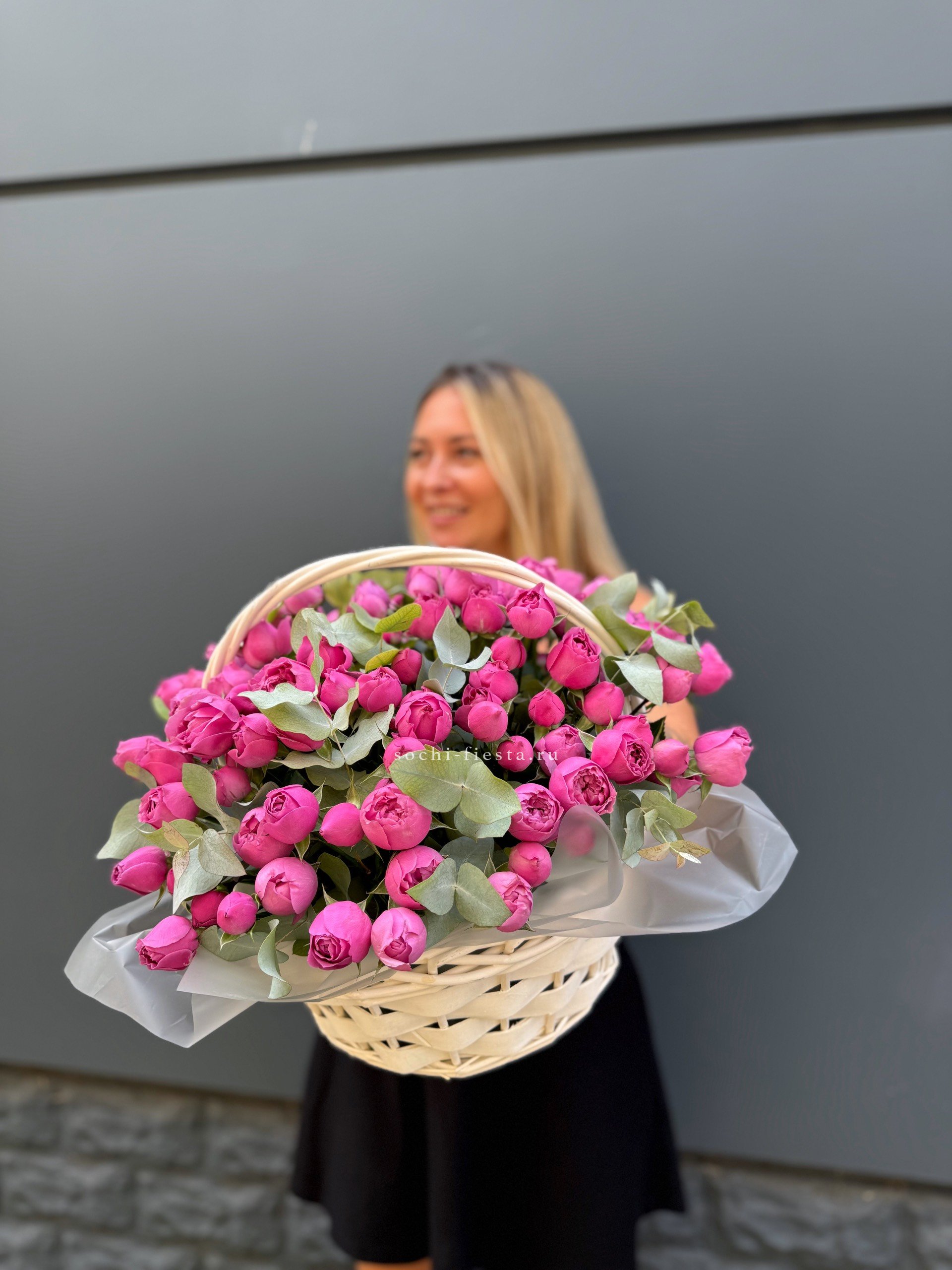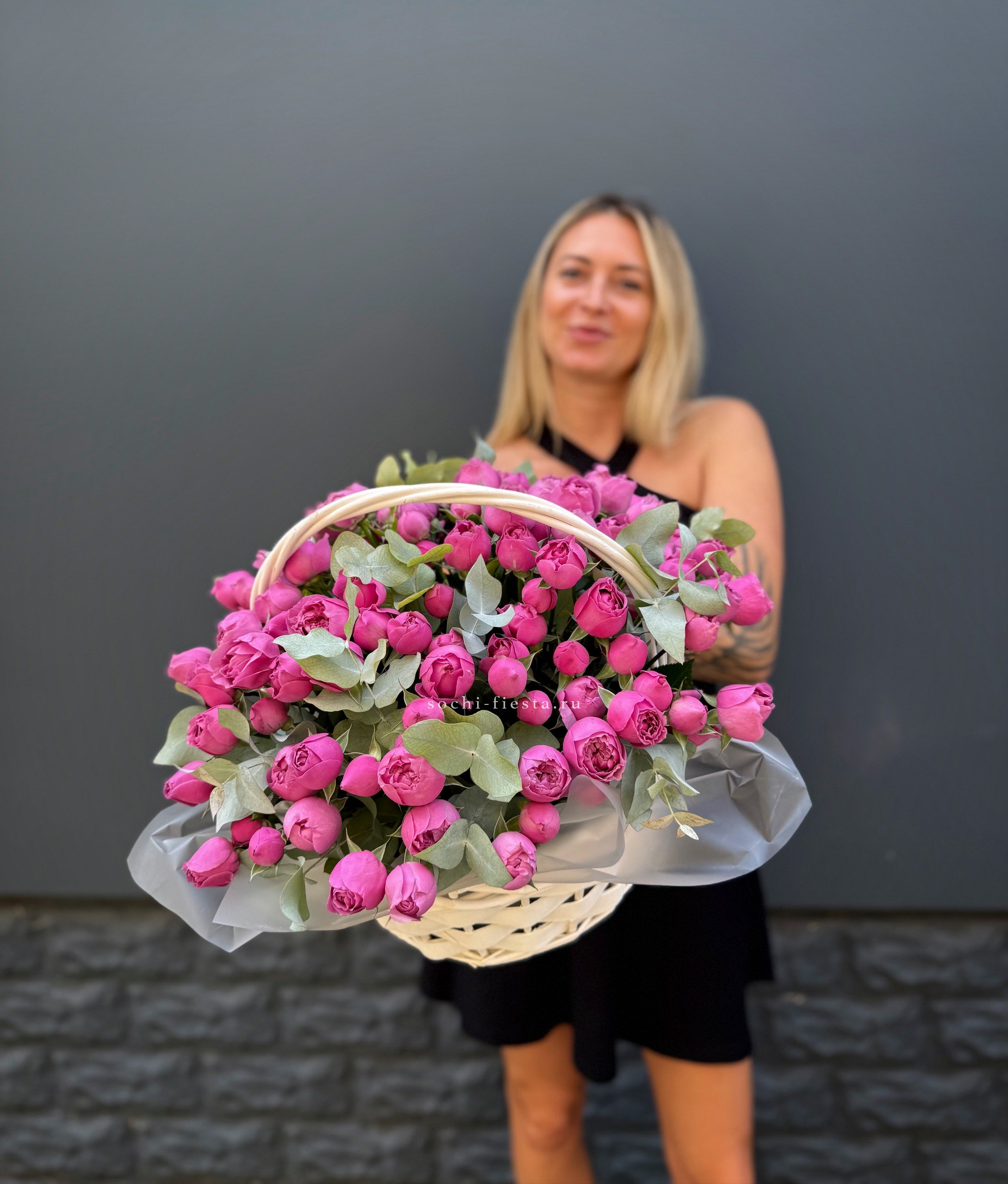 555 роз, зелень (папоротник или эвкалипт, в зависимости от сезона) оформление в корзину. Длина надписи не должна превышать 4 букв.